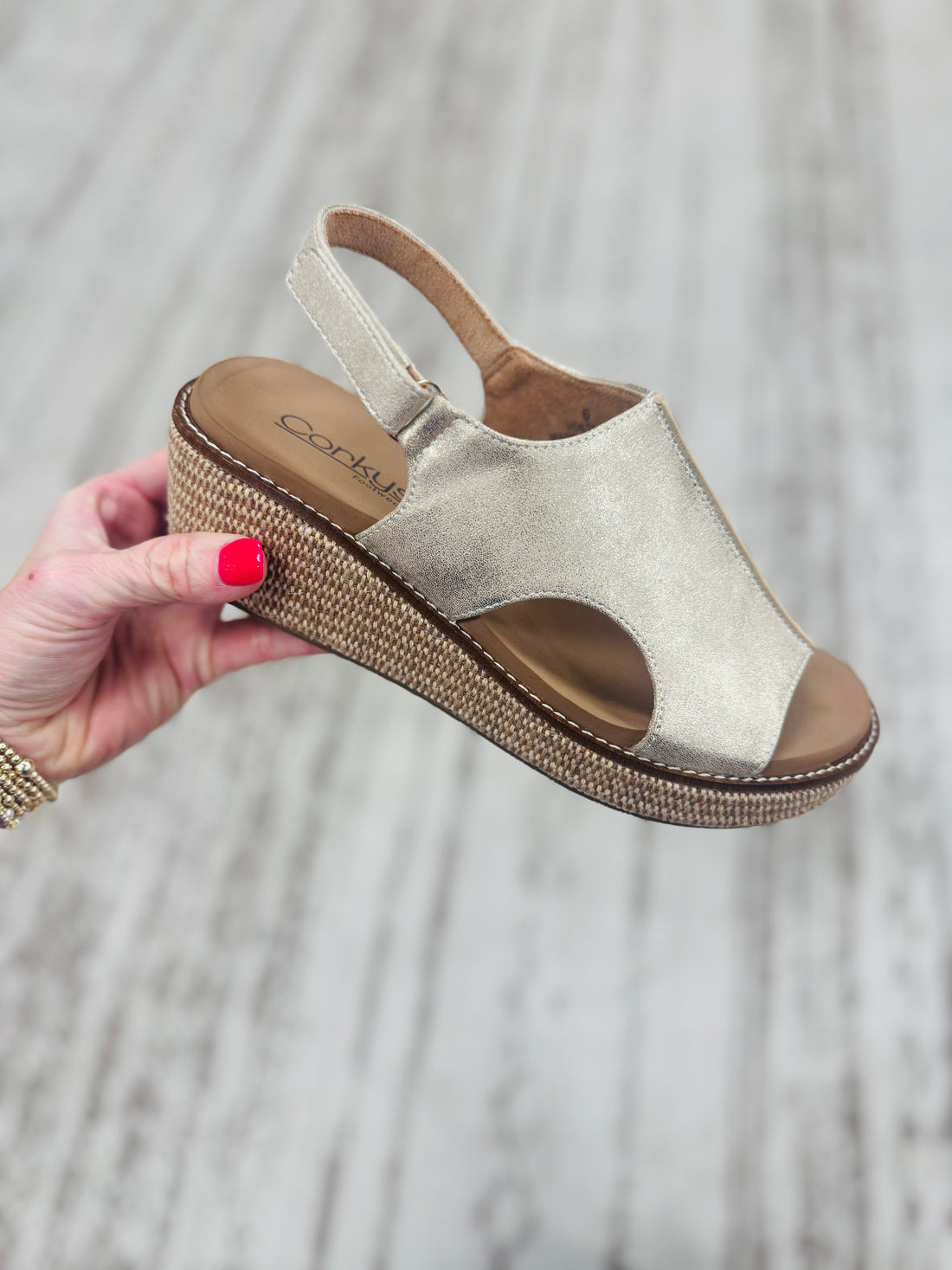 Corky's Off The Deep End sandal in radiant gold delivers effortless summer style. Crafted with...