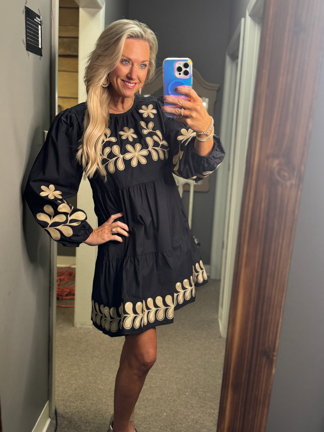This tiered babydoll dress features elegant long puff sleeves and delicate embroidery, combining comfort with...