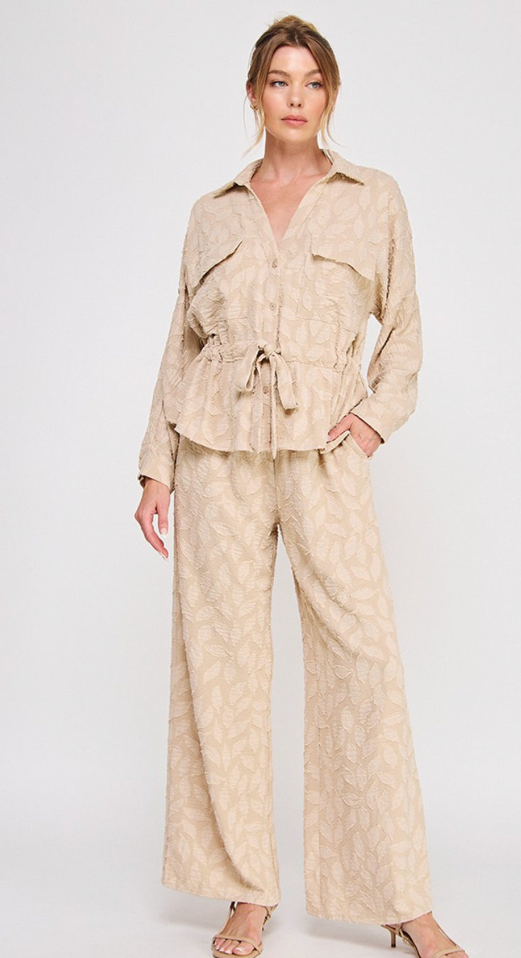 Elevate your everyday wardrobe with this sophisticated two-piece set featuring a jacquard utility tie-waist blouse...