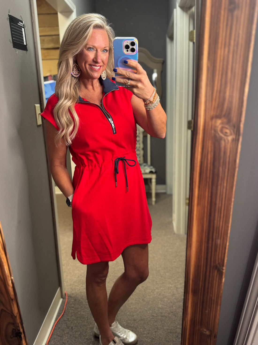 Elevate your wardrobe with this drop sleeve knit mini dress featuring a stylish zip-up collar...