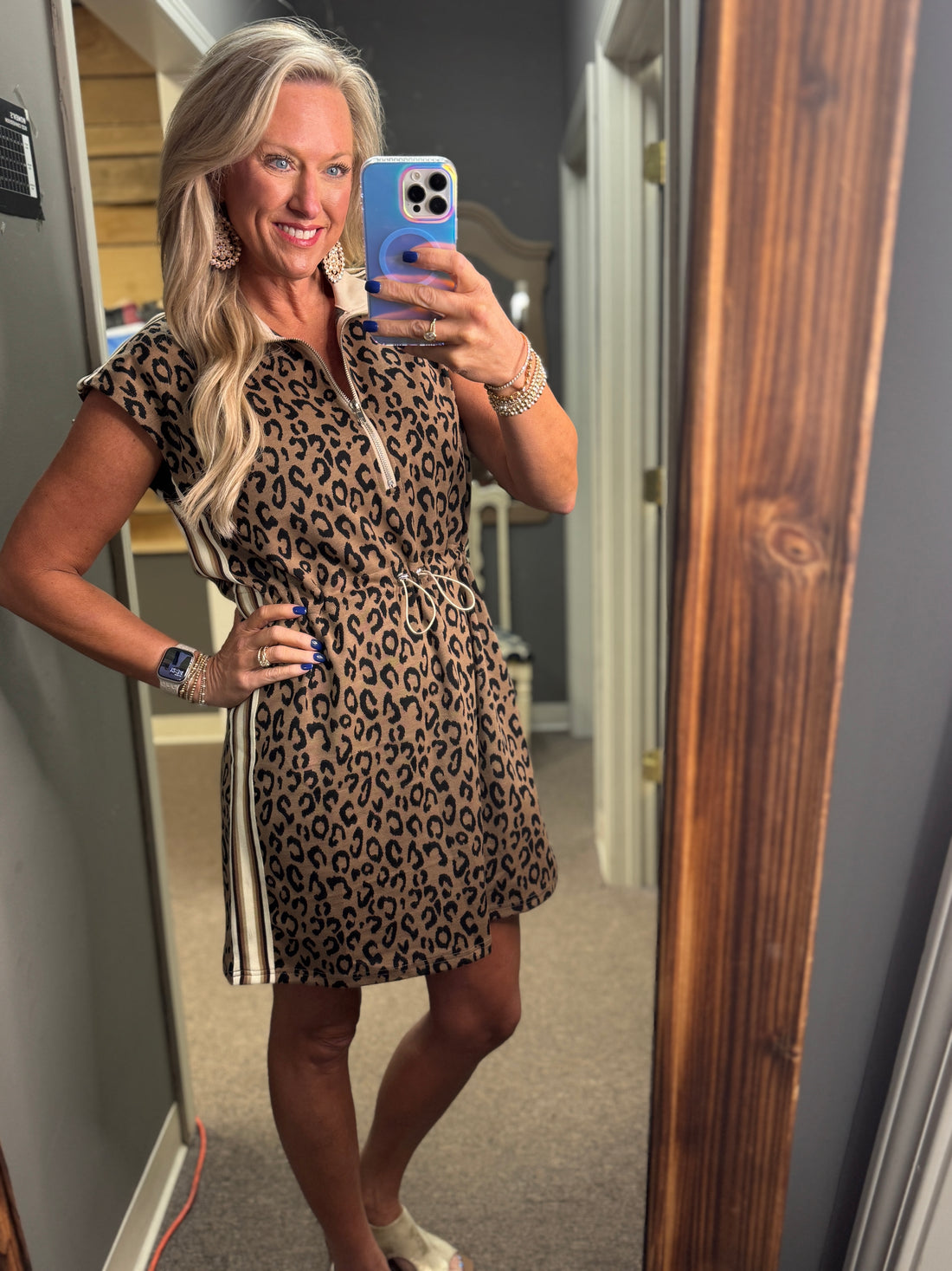This short sleeve half-zip mini dress features a bold leopard print knit design, accented with...