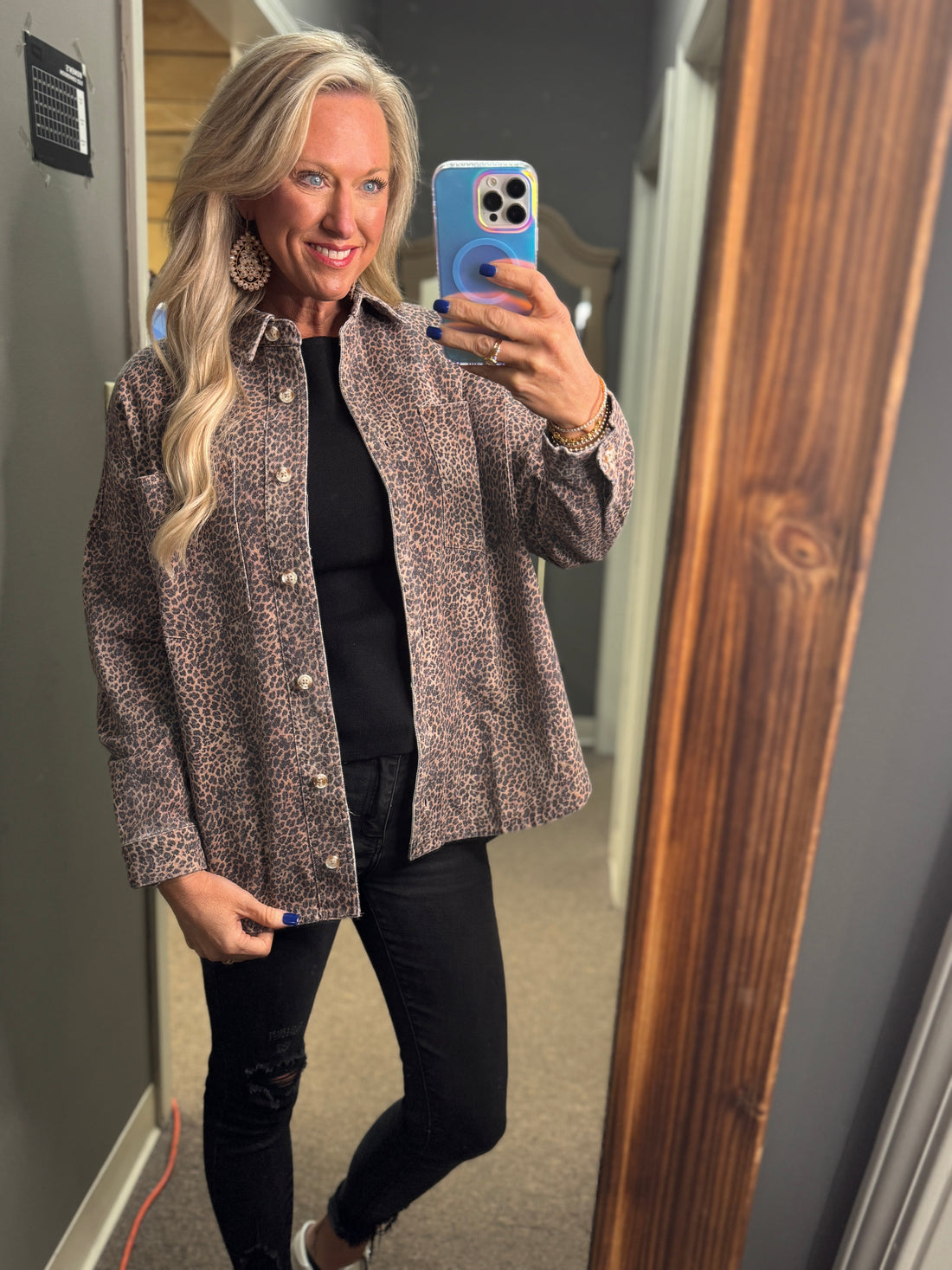 Elevate your wardrobe with the Leopard Print Twill Washed Shacket, combining bold style with cozy...