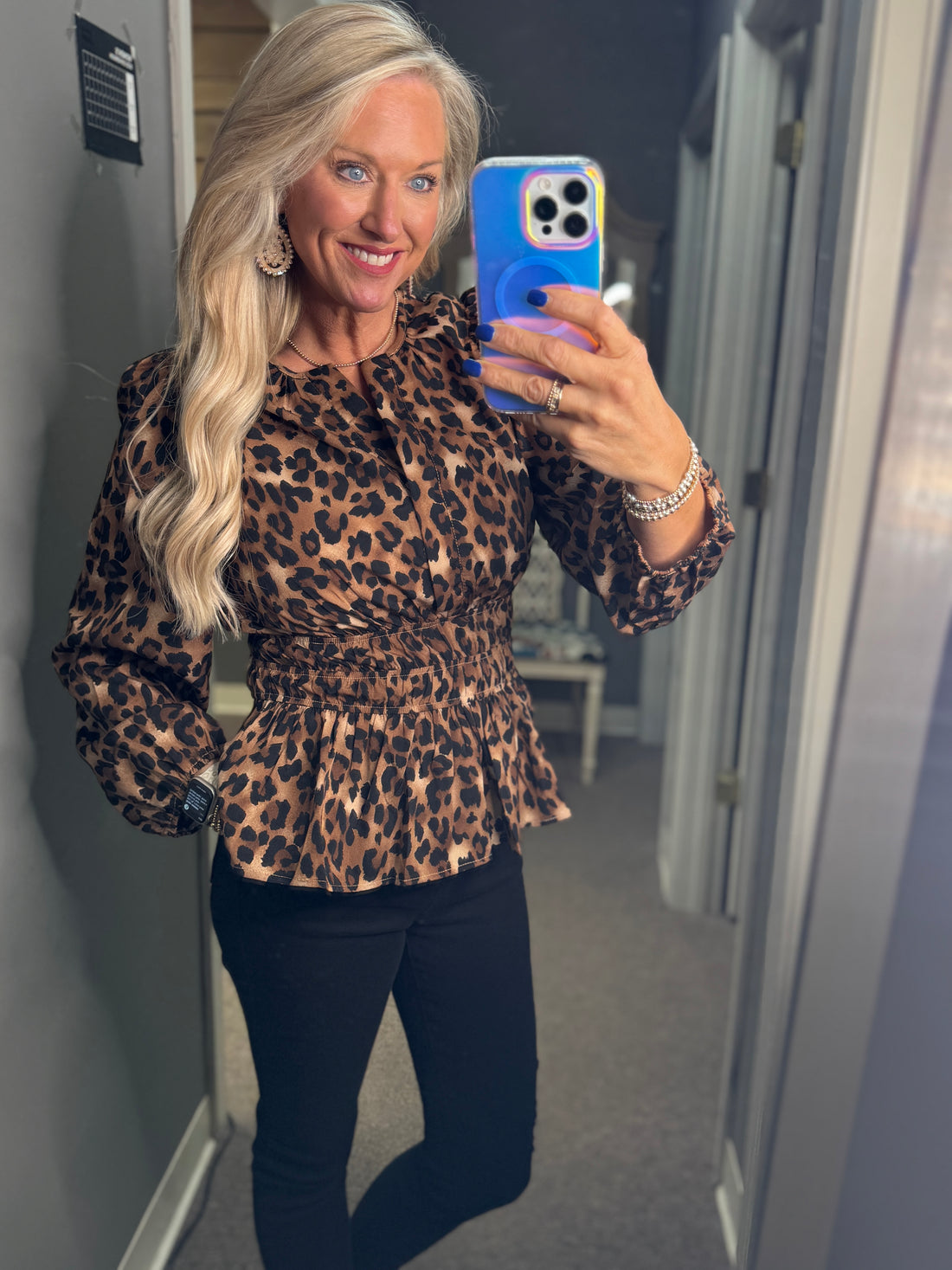 Elevate your wardrobe with this long sleeve woven top featuring a bold leopard print and...