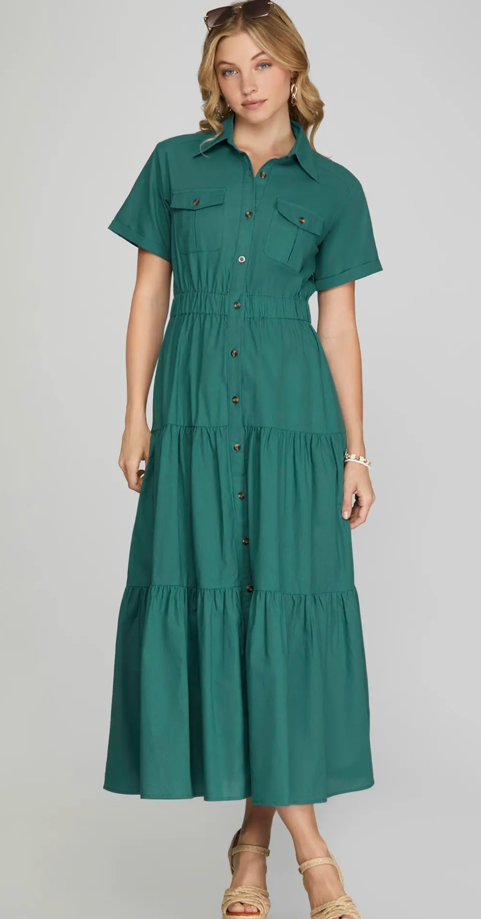 This half sleeve button-down maxi dress features a flattering tiered design and a comfortable elastic...