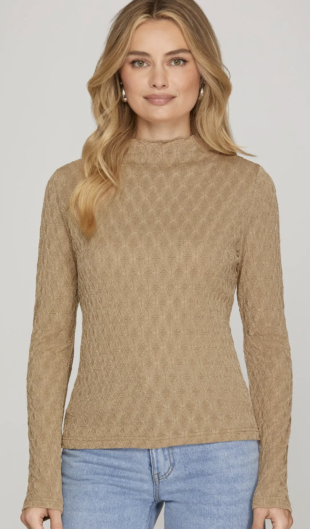 Elevate your wardrobe with this Long Sleeve Mock Neck Shine Knit Top. Its subtle shimmer...