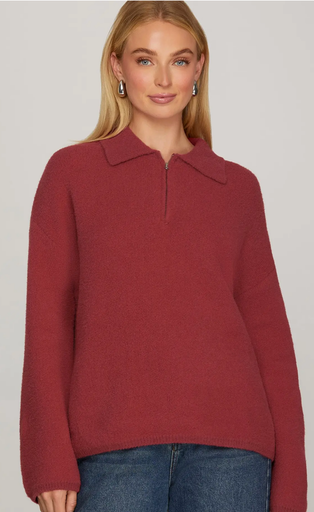 Stay cozy and stylish with this long sleeve half zip fuzzy sweater top. Its soft,...