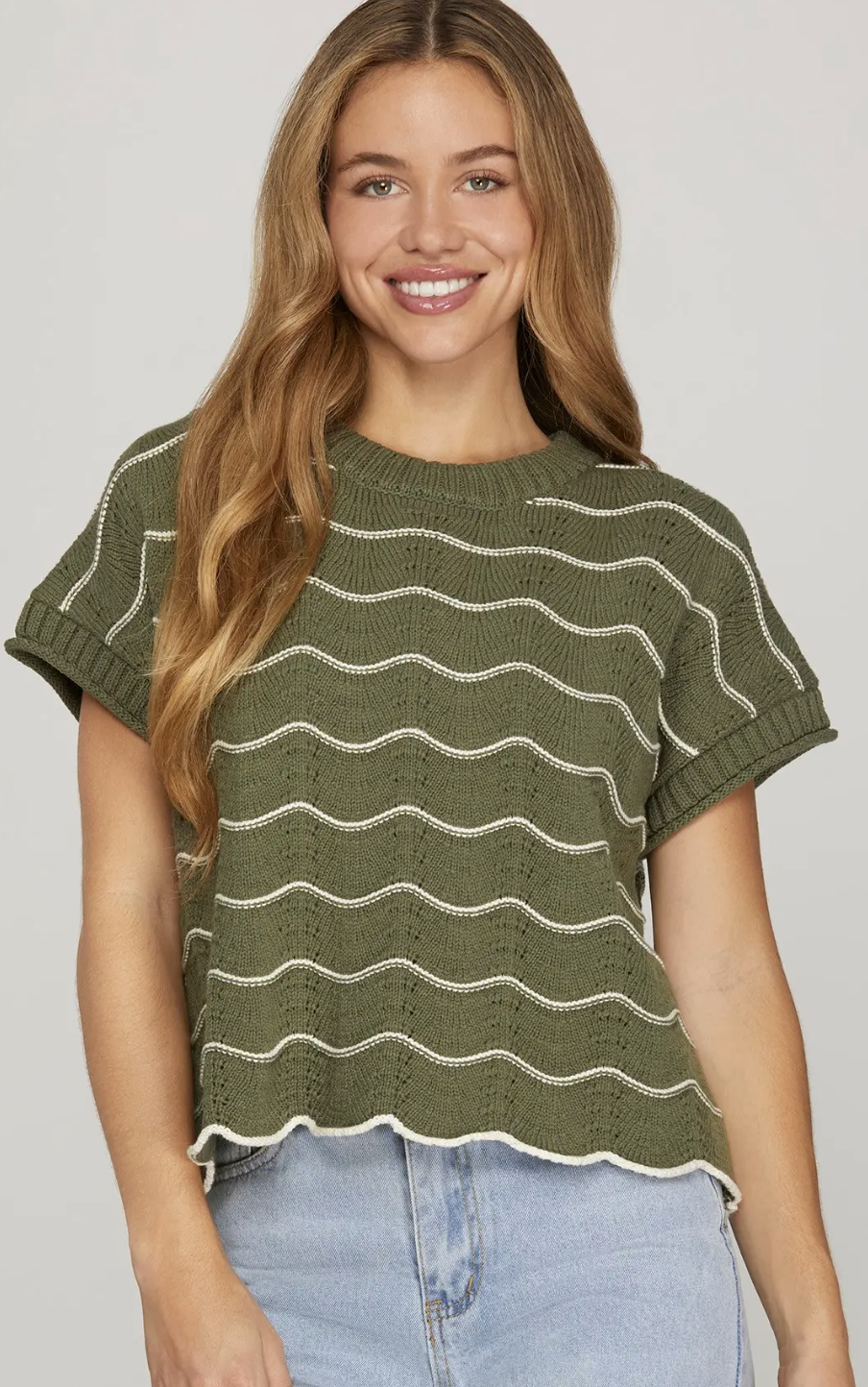 Elevate your casual wardrobe with this drop short sleeve scallop striped knit sweater top. Its...