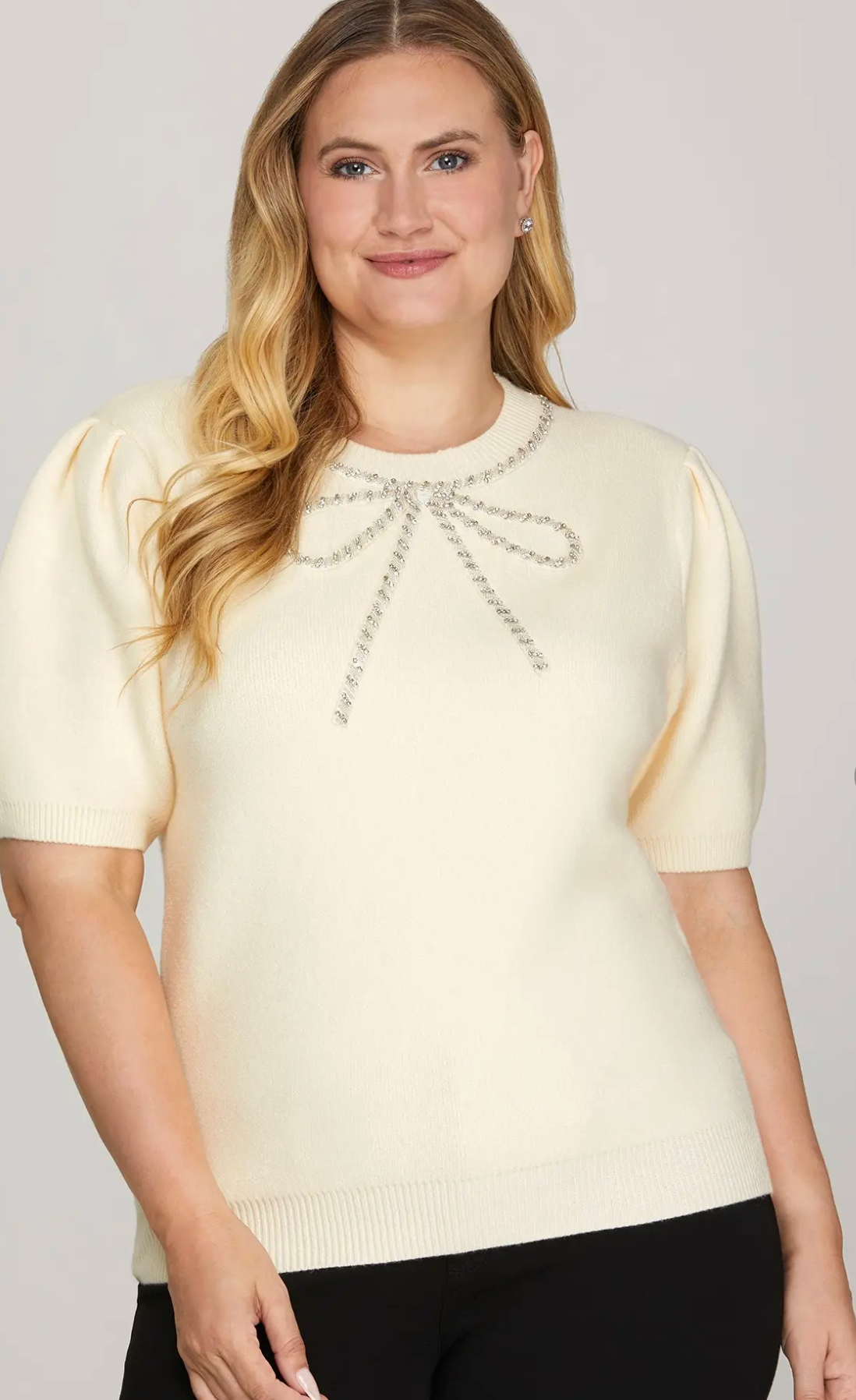 Elevate your wardrobe with the PLUS Half Sleeve Beaded Bow Sweater Top. Featuring delicate beadwork...