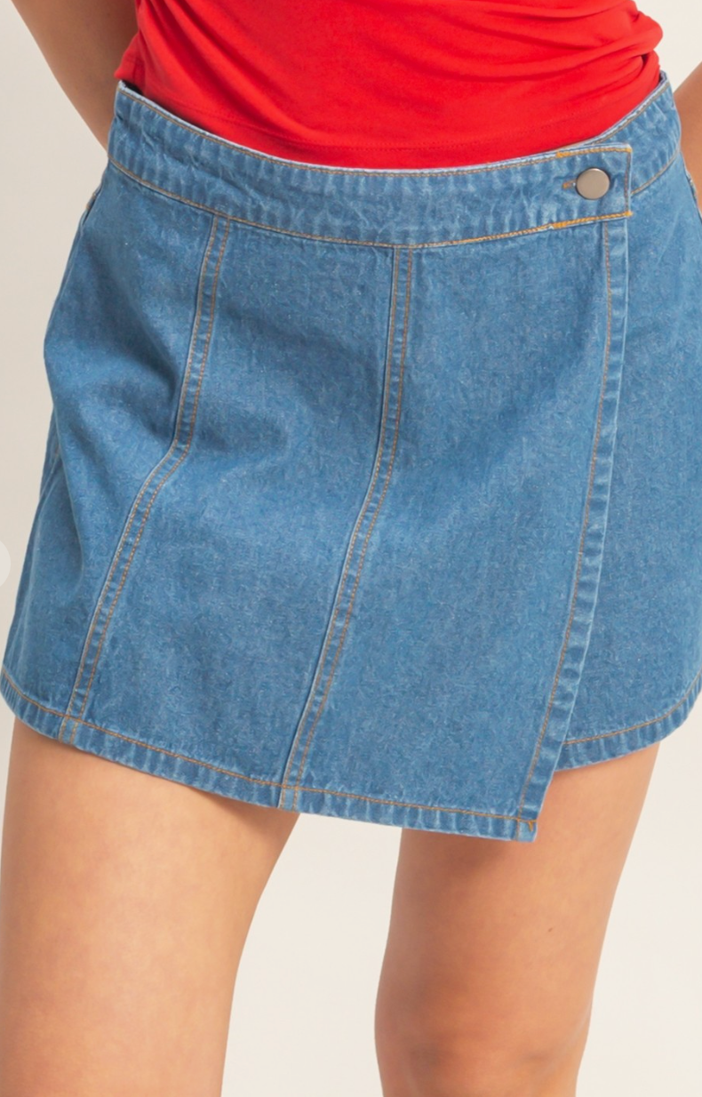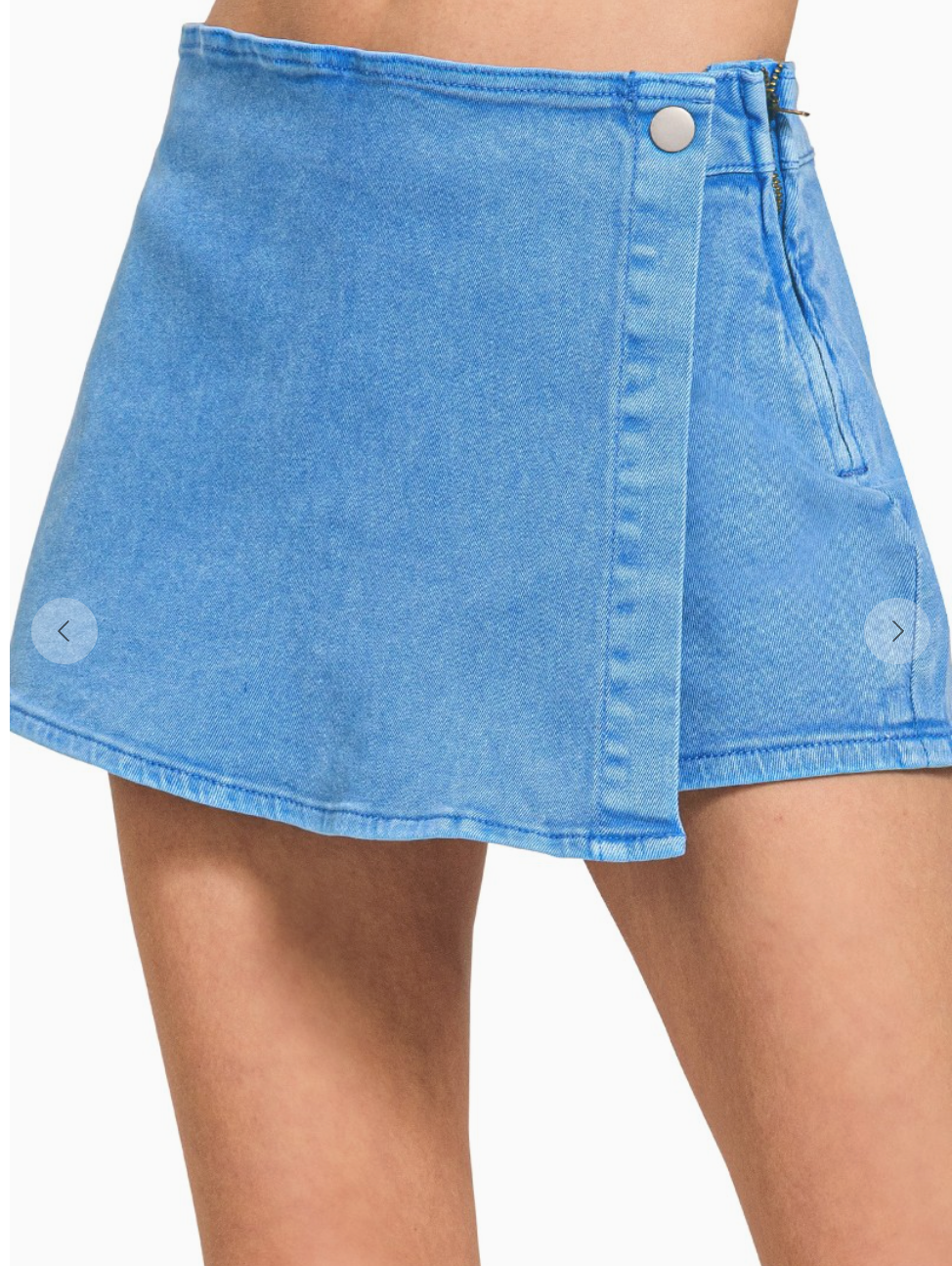 Our Zip Up Denim Wrap Skort is a chic and edgy addition to your wardrobe....