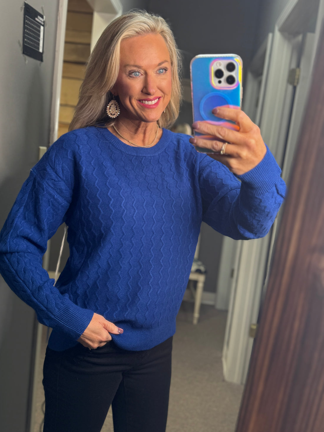 This long-sleeve sweater combines cozy warmth with stylish sophistication. Featuring a unique textured zig-zag pattern...