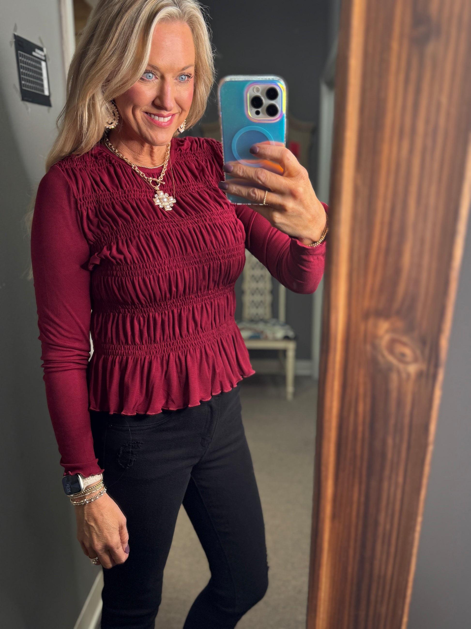 Elevate your wardrobe with this Round Neck Long Sleeve Smocked Top, designed for both style and comfort. The smocked detailing adds a flattering, textured fit that accentuates your silhouette, while the long sleeves provide warmth and versatility for cooler days. Its classic round neckline complements any outfit, making it perfect for casual outings or smart layering. Embrace effortless elegance and boost your everyday look with this must-have top.