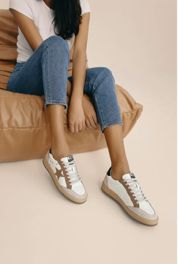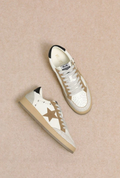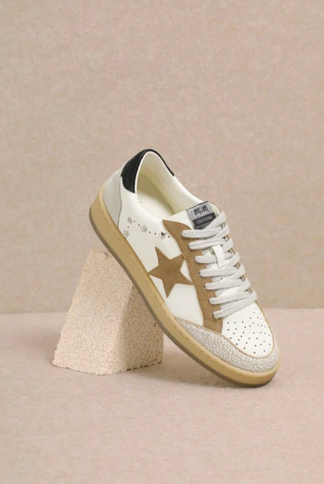 Step into the spotlight with the AVERY - Taupe Leather Suede Glitter Star Sneakers. These eye-catching sneakers feature a unique taupe cracked leather design, enhanced with an embroidered star on the side for added sparkle. Crafted from a blend of synthetic materials, leather, and suede, these sneakers are not only stylish but also comfortable, ensuring you feel great whether you're on the move or just chilling. Perfect for those who love to stand out with a touch of glam.