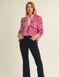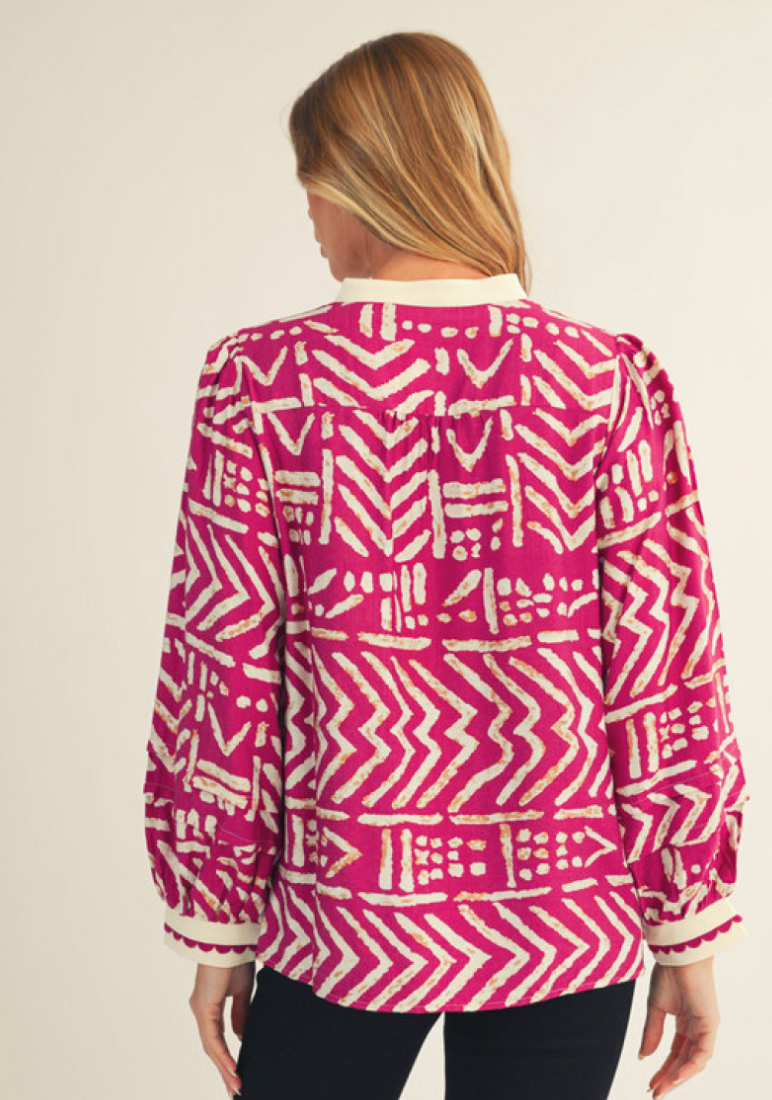 Elevate your wardrobe with this long sleeve tribal print top featuring a flattering V-neckline and delicate scallop tape trim detail. Its unique pattern and refined accents make it perfect for both casual outings and stylish gatherings, offering comfort without sacrificing fashion. Make a statement effortlessly with this versatile and eye-catching piece.