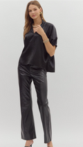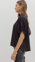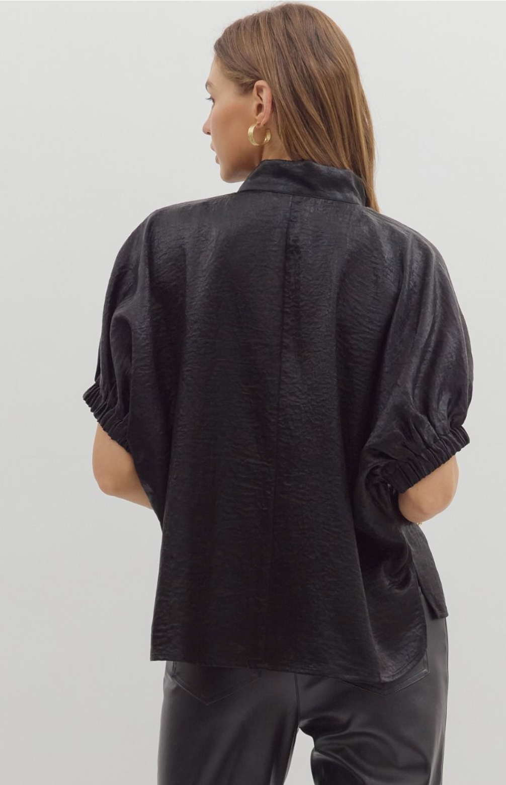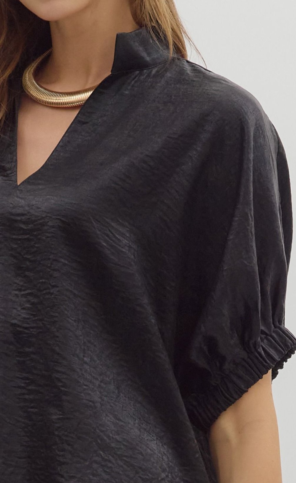 This metallic V-neck top features a stylish band collar and flattering short dolman sleeves for a modern silhouette. Crafted from lightweight woven fabric, it offers comfort without lining while maintaining a non-sheer finish. Perfect for adding a touch of shimmer to any outfit, this versatile top effortlessly combines elegance with ease.
