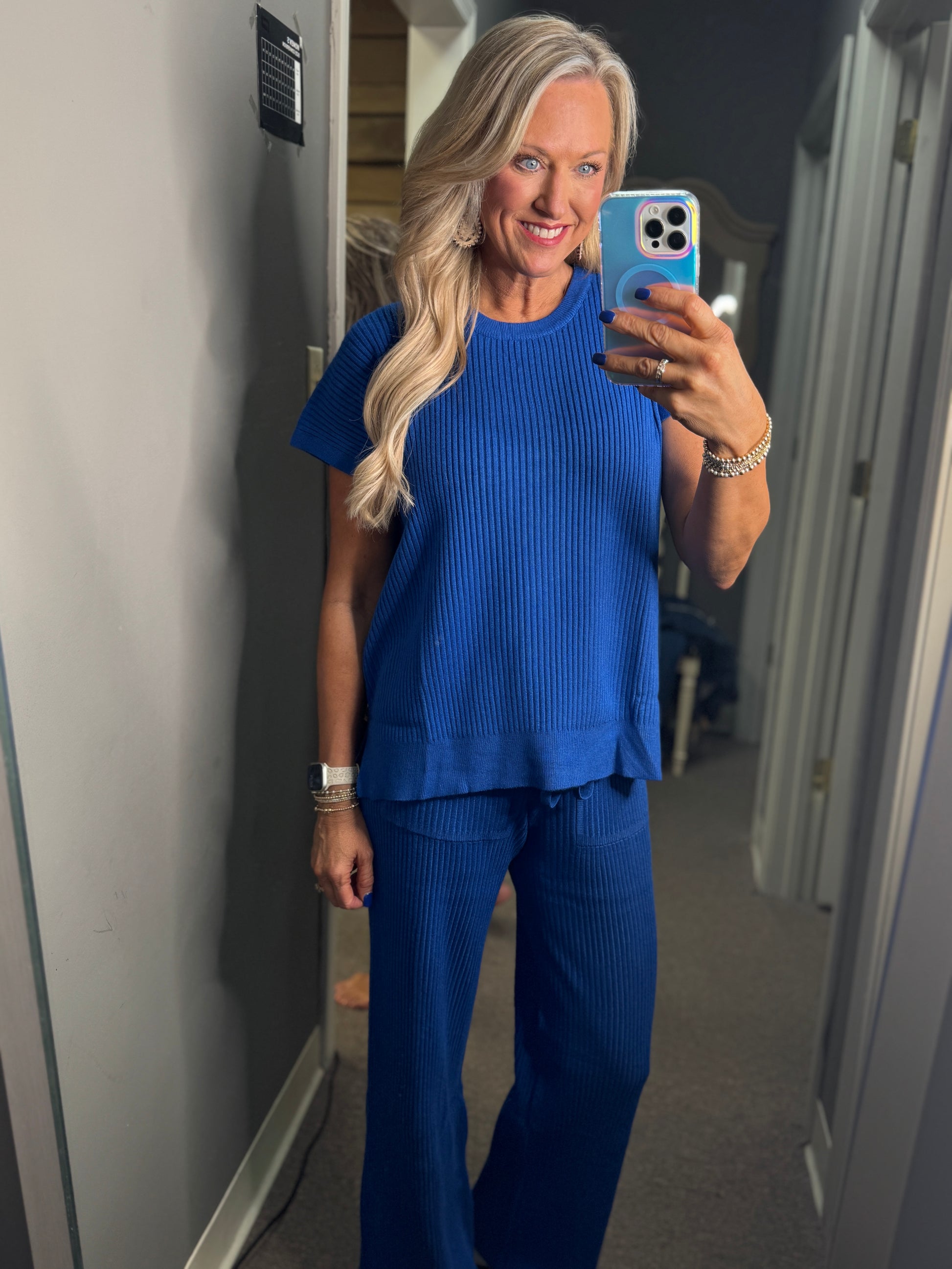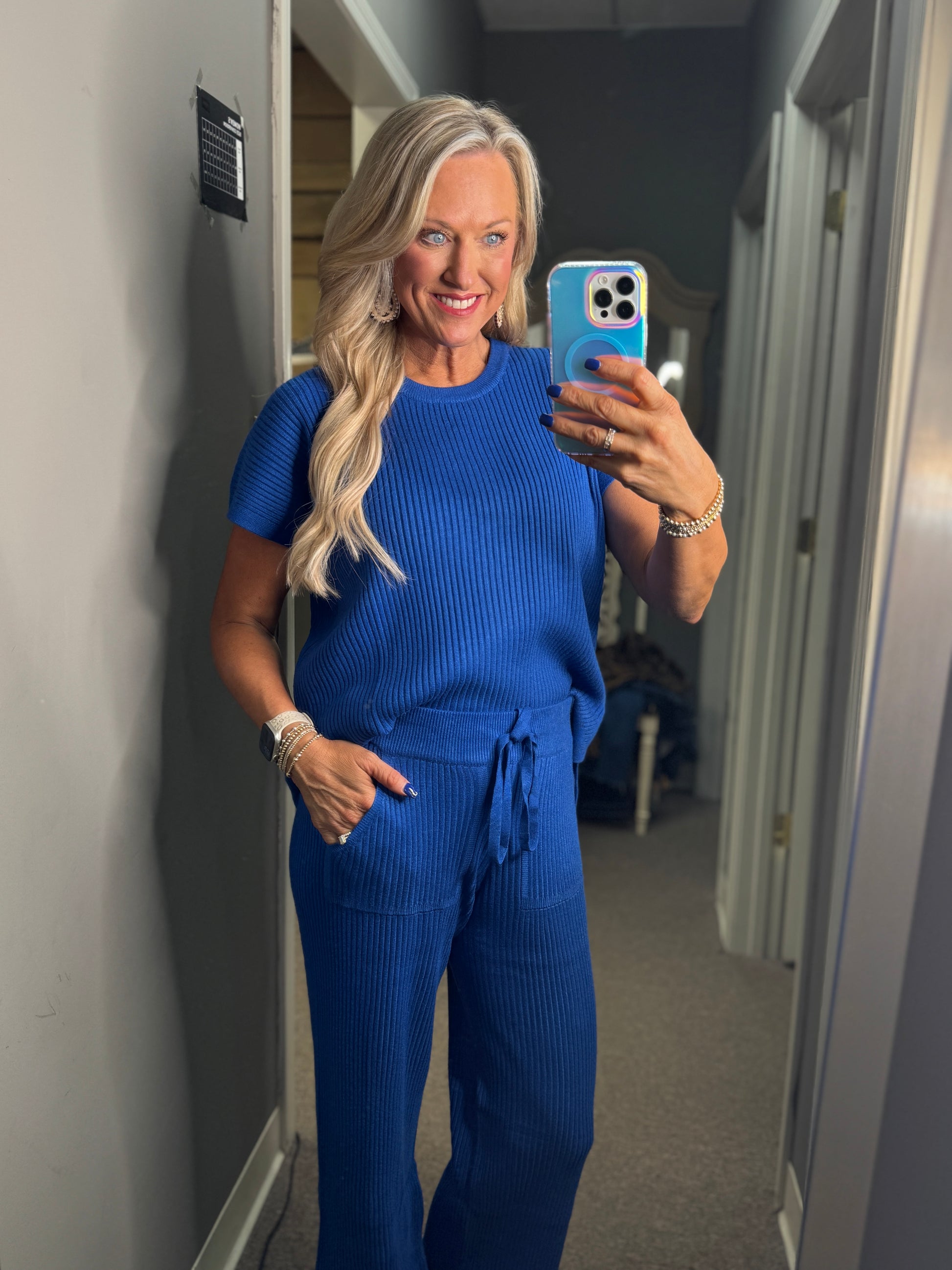 This ribbed short sleeve top paired with knit pants in a calming blue offers effortless style and comfort. The textured fabric gently hugs your silhouette while allowing breathability, making it perfect for all-day wear. Whether lounging at home or stepping out, this set combines cozy softness with a sleek, modern look you'll love to wear again and again.