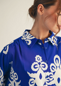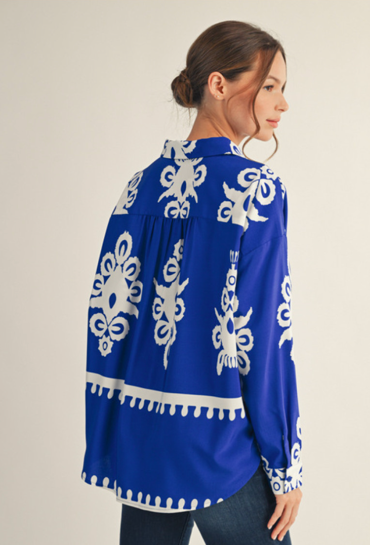 Elevate your wardrobe with this drop shoulder button-down shirt featuring an elegant damask border print. Thoughtful shirring on the shoulders and back adds a subtle yet stylish texture, ensuring a flattering fit and effortless comfort. Perfect for those who appreciate refined details with a relaxed silhouette.
