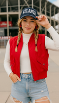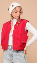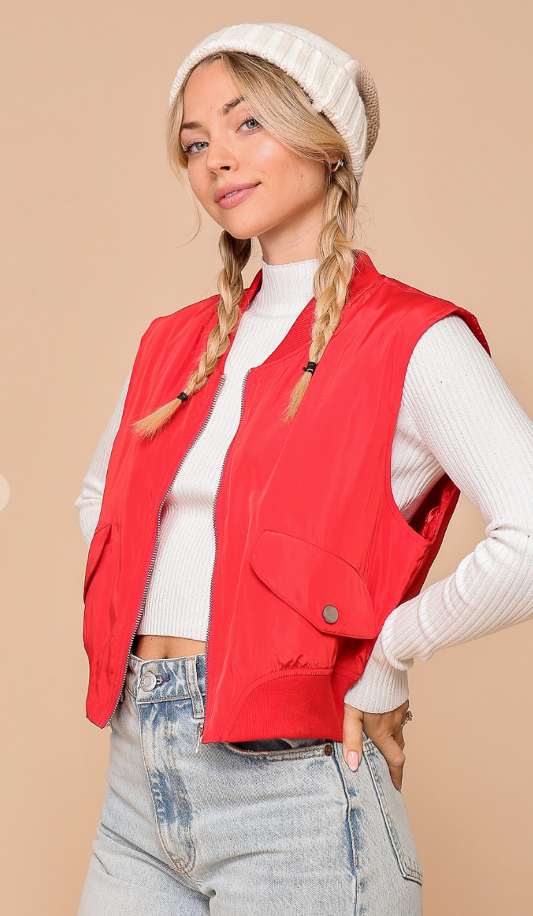 Stay warm and stylish with this sleeveless zip-up bomber vest designed for maximum comfort. Its snug hem and waist block cold air, keeping you cozy during chilly days. The front zipper allows for effortless layering, while the welt pockets provide a convenient place to warm your hands or store essentials. Ideal for back-to-school days, coffee runs, and brisk fall or winter outings, this versatile vest combines functionality with a sleek look you'll reach for again and again.
