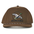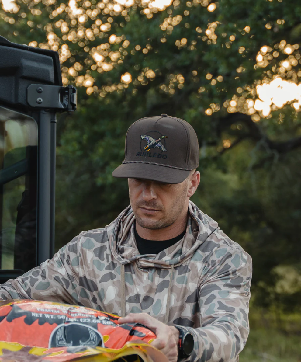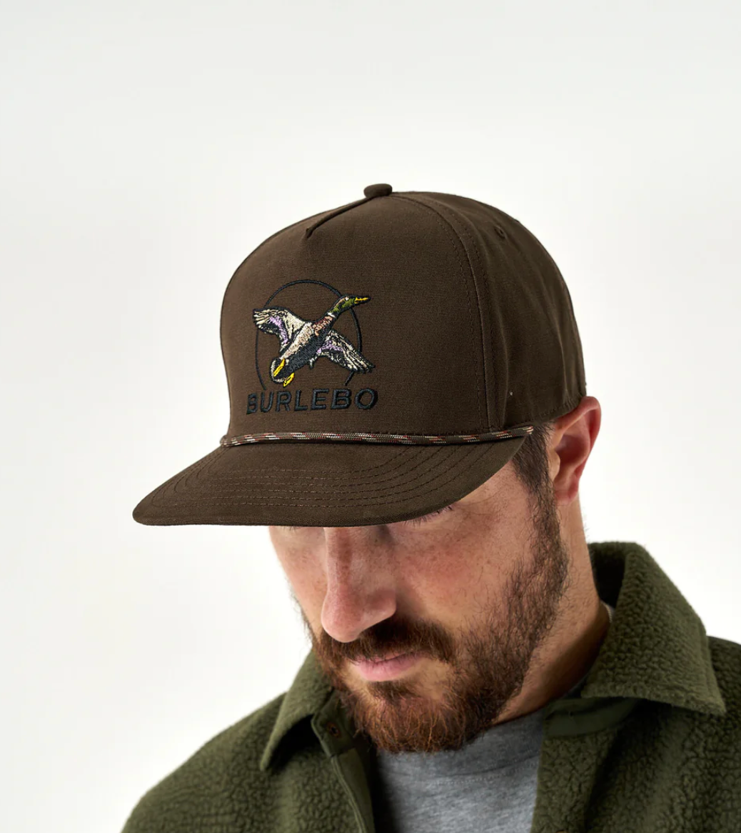 Take flight in style with the Fly By Brown Cap from BURLEBO. Featuring an embroidered mallard in mid-flight, this cap captures the spirit of the outdoors with rugged charm. Set against a deep brown background, the bold artwork is complemented by a black rope detail across the front panel for a classic touch. Built for comfort and durability, this cap is perfect for everyday wear, whether you're in the field, on the water, or just out and about.