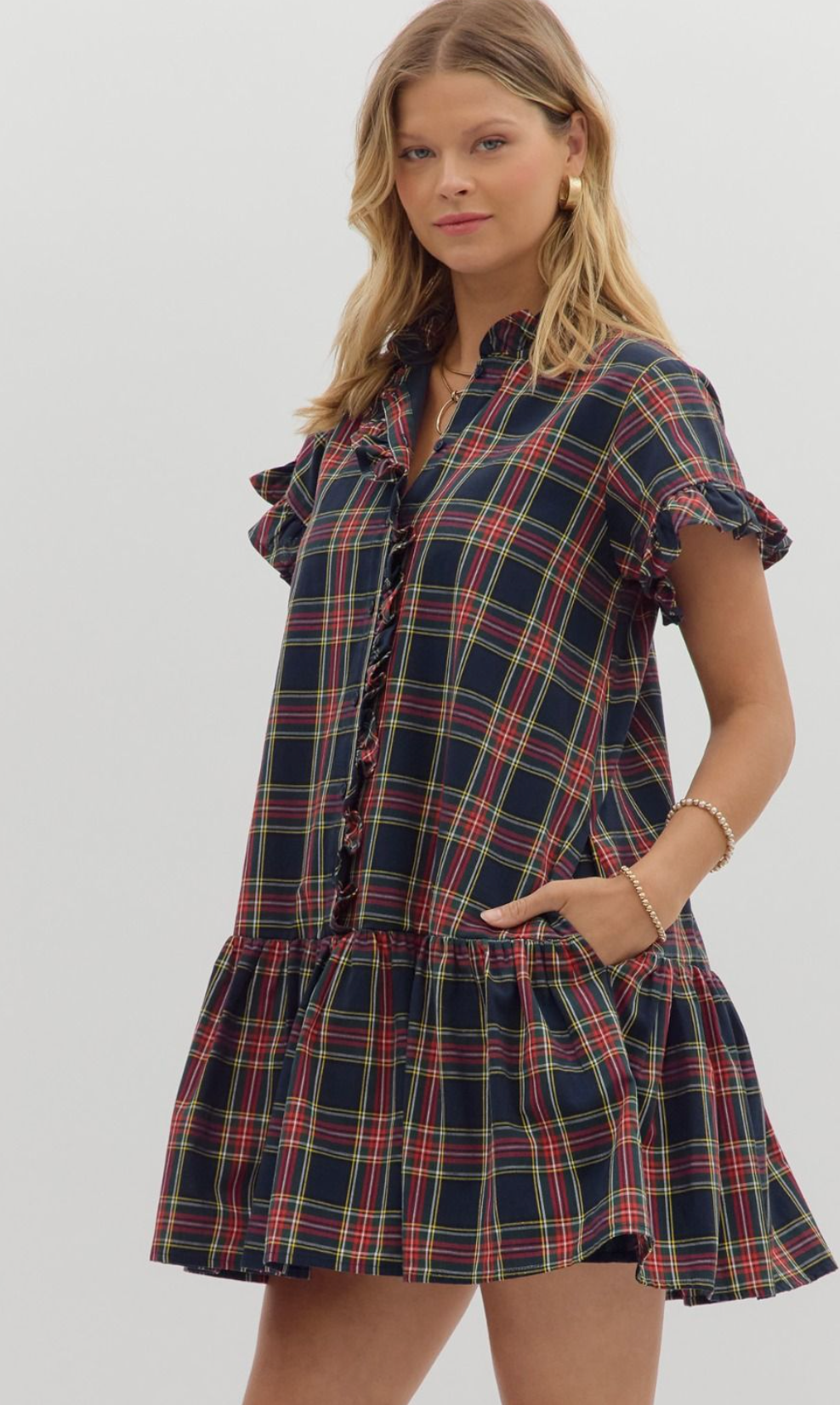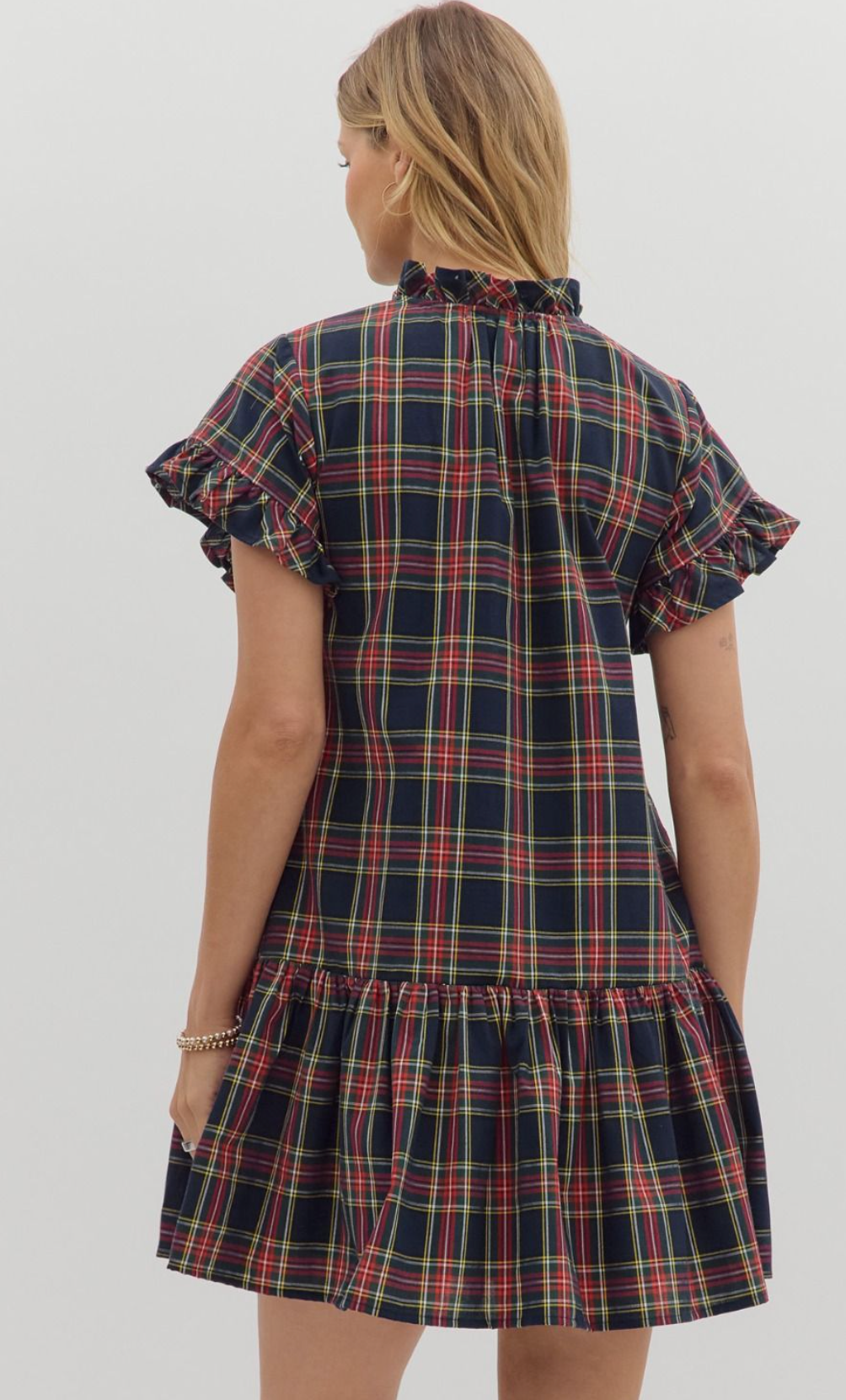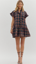 This lightweight mini dress features a charming plaid pattern with ruffle accents along the hem and button closure, adding a playful touch to your look. Designed with convenient side pockets and a fully lined, woven fabric, it offers comfort and coverage without being sheer. Perfect for effortless style, this dress combines feminine details with practical design for your everyday wardrobe.