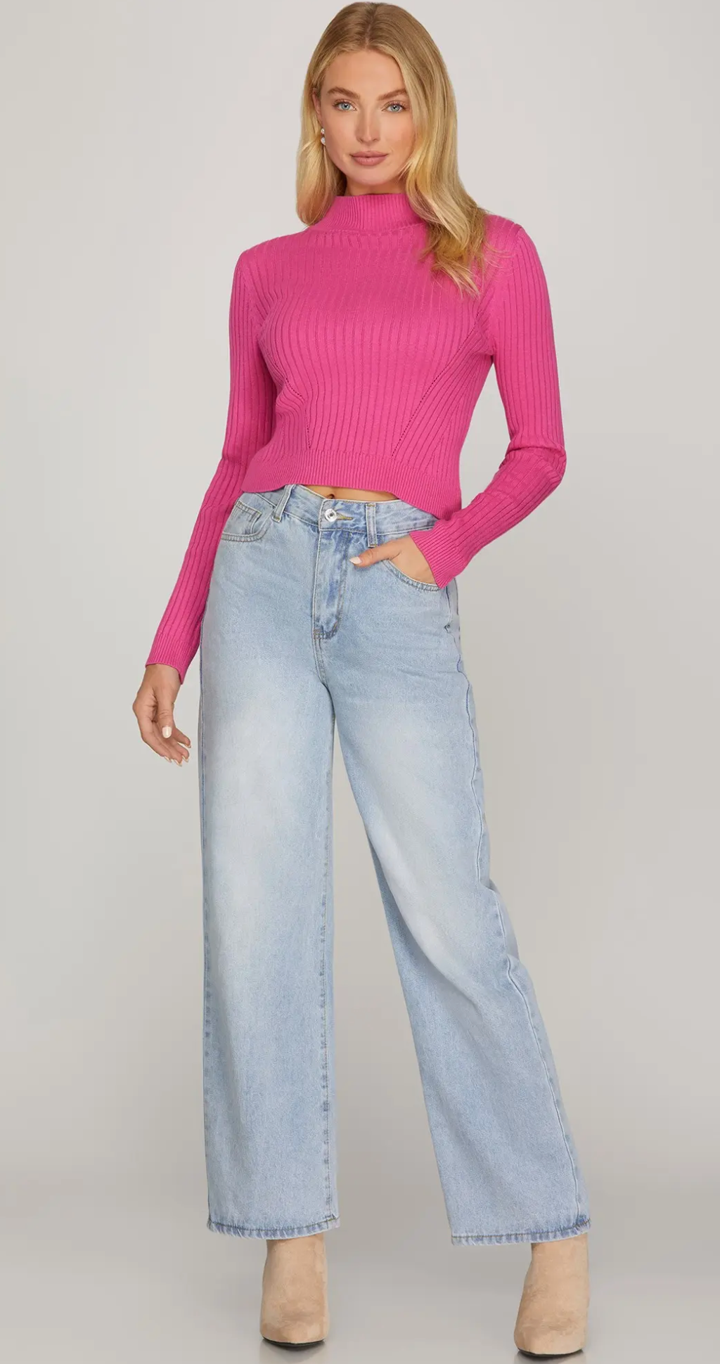 Elevate your wardrobe with this long sleeve mock neck ribbed crop sweater top. Crafted for a flattering fit, its textured ribbed fabric hugs your silhouette while the mock neck adds a touch of sophistication. Perfect for layering or standalone wear, this crop sweater blends comfort with modern style, making it a versatile piece for any season.
