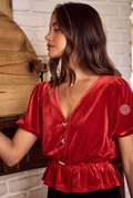 Elevate your holiday wardrobe with this stunning velvet top, designed to turn heads at every festive gathering. The luxurious velvet fabric drapes beautifully while the delicate ribbon embellishments add an elegant touch of sophistication. Perfect for Christmas parties, family dinners, or special seasonal occasions, this piece combines comfort with undeniable style. The rich texture and refined details make it a versatile choice that pairs effortlessly with your favorite skirts or pants. Make a memorable impression this holiday season with a top that captures the magic of the moment.