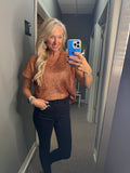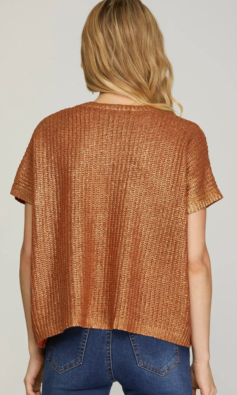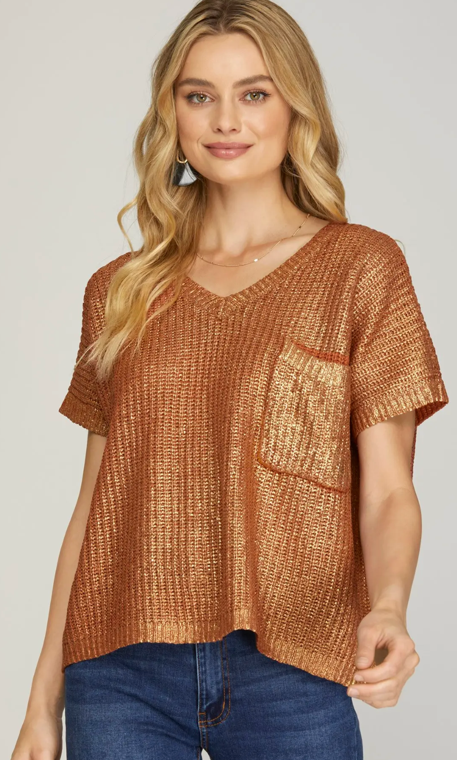 Elevate your wardrobe with this short sleeve V-neck sweater top featuring a metallic coating for a subtle shimmer. Its lightweight fabric offers all-day comfort, while the front pocket adds a stylish and practical detail. Perfect for dressing up or down, this top combines modern flair with everyday ease.