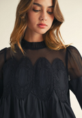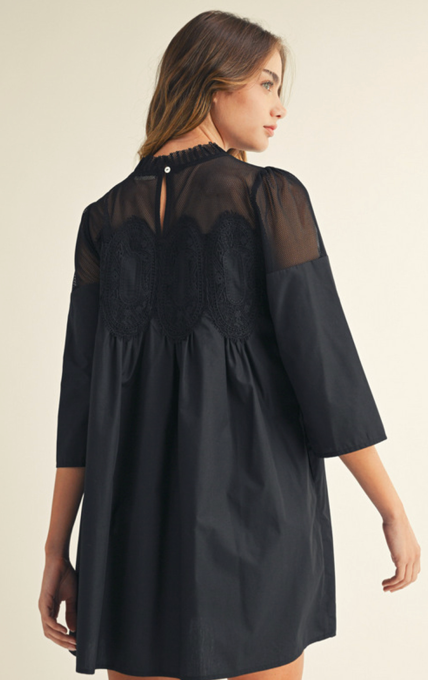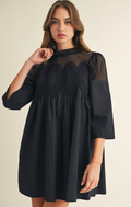 This 3/4 sleeve babydoll dress combines comfort and style effortlessly. Featuring a delicate mesh contrast and crochet lace trim, it adds a feminine touch to your look. Convenient side pockets enhance practicality, while the button closure at the back ensures a perfect fit. Ideal for any casual or semi-formal occasion, this dress offers both charm and ease in one elegant piece.
