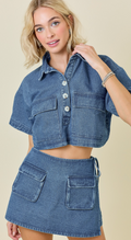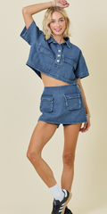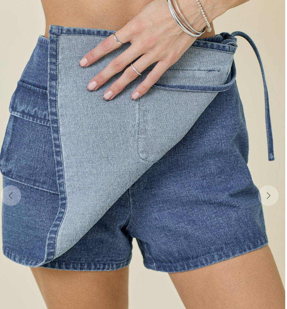 This denim wrap skort combines the casual appeal of denim with the ease of a skirt, featuring convenient pockets and adjustable side ties for a perfect fit. Its versatile design lets you move freely while keeping essentials close, making it an ideal choice for effortless style and comfort throughout your day.