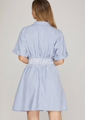 Half-sleeve gingham mini dress featuring elegant waist pintucks and intricate back smocking for a refined silhouette. Functional pockets add everyday practicality to this woven piece. The fitted bodice and A-line skirt create a flattering shape that transitions seamlessly from casual outings to weekend gatherings. Model is 5'8" wearing size small, showing how the dress hits at the knee with a polished, put-together look. Perfect for those seeking timeless style with thoughtful construction details.
