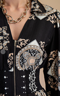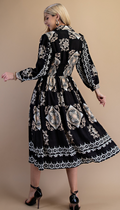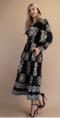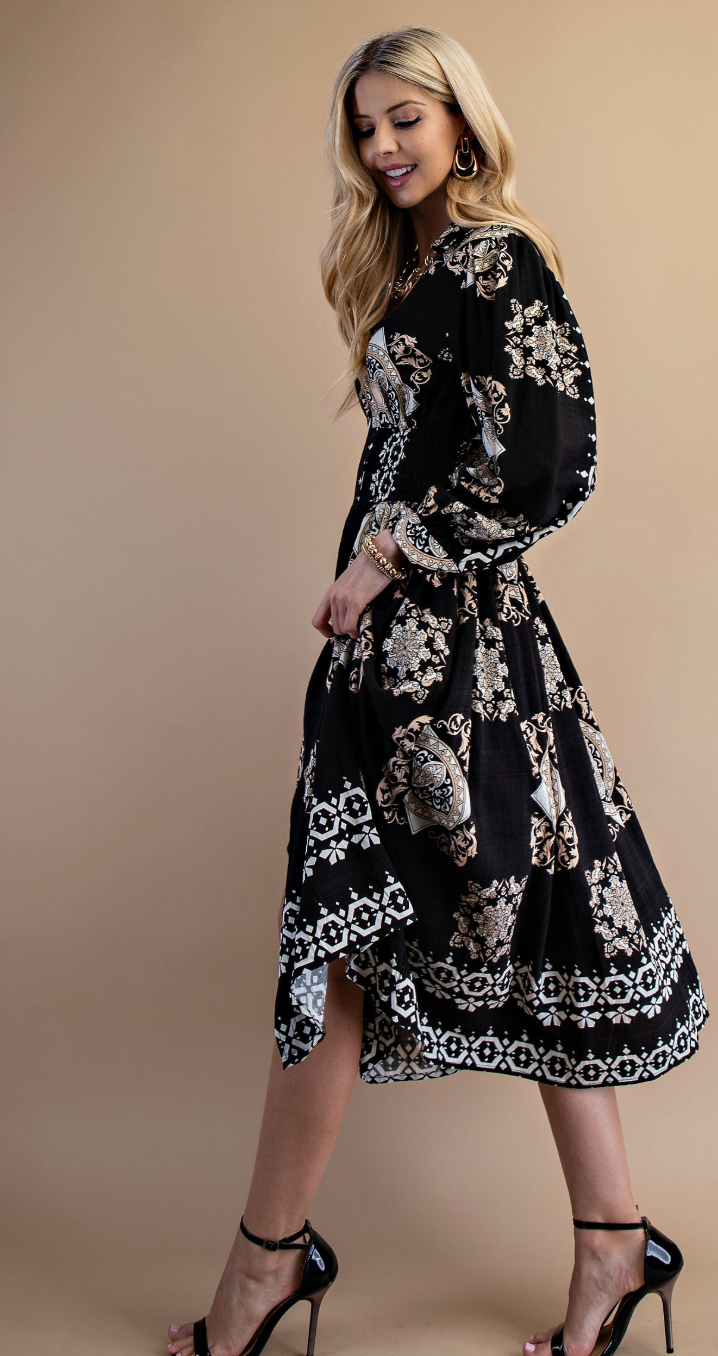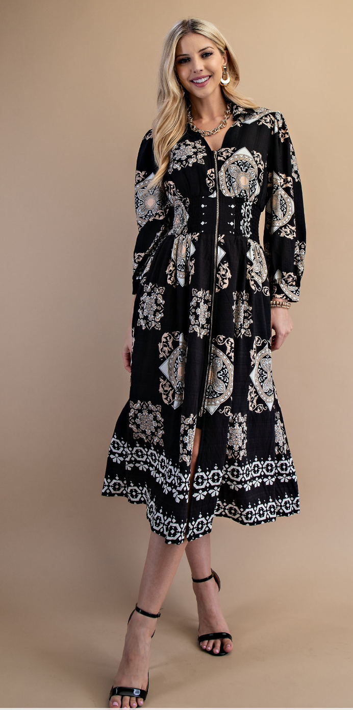 Elevate your style with this Tile Print Long Sleeve Midi Dress, designed to blend comfort and elegance effortlessly. The front zipper offers easy wear and a modern touch, while the smocked waist enhances your silhouette for a flattering fit. Perfect for both casual outings and sophisticated events, this dress combines eye-catching tile patterns with a versatile midi length, making it a wardrobe essential that stands out with subtle charm.
