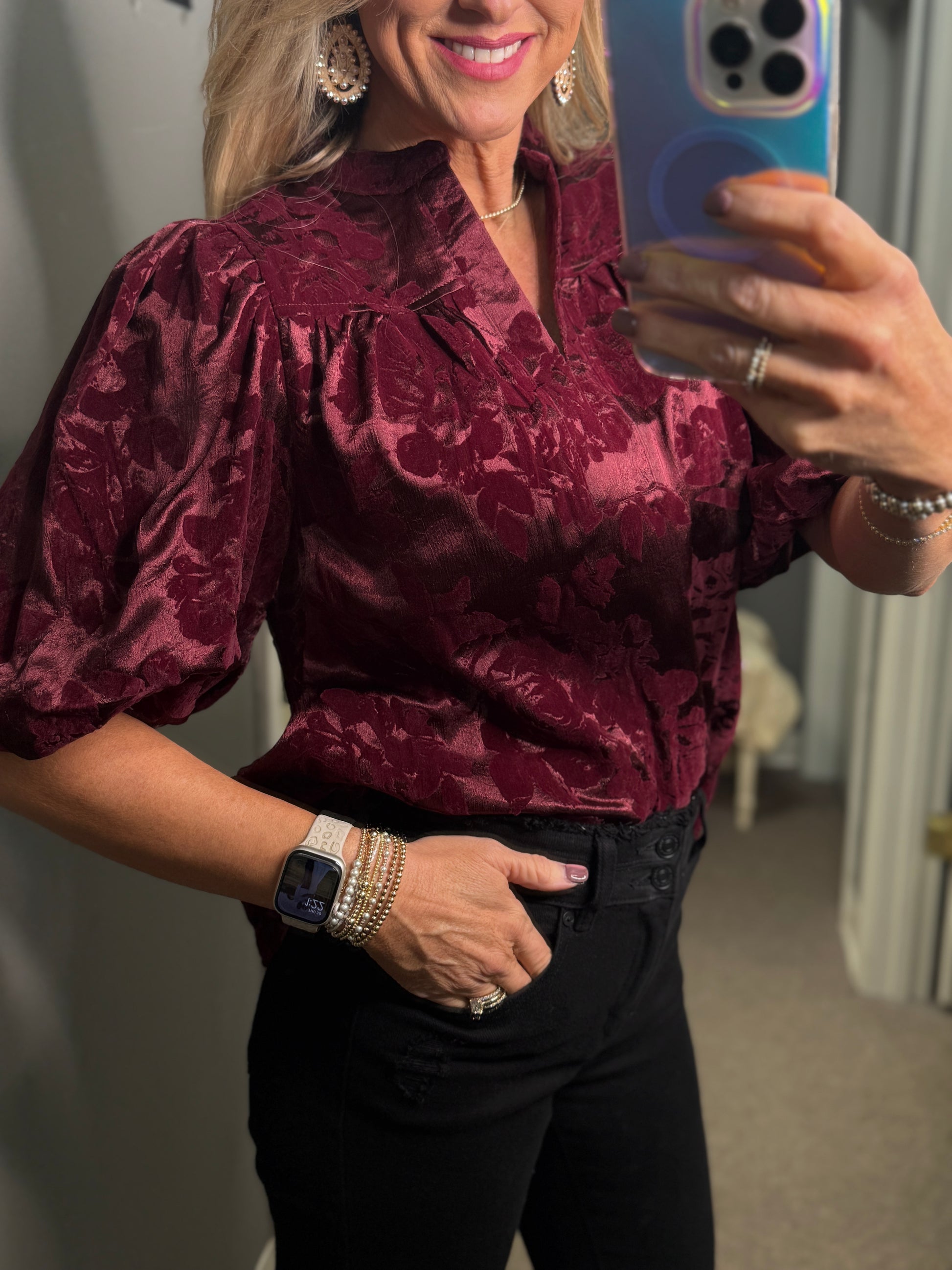 Elevate your wardrobe with this Elegant Velvet Floral Top, featuring a graceful high round neck and stylish puff sleeves. Its luxurious velvet fabric offers a soft, comfortable fit while the delicate floral pattern adds a touch of sophistication. Perfect for both casual outings and special occasions, this top effortlessly blends classic charm with modern elegance, ensuring you stand out with confidence and style.