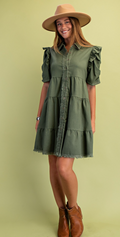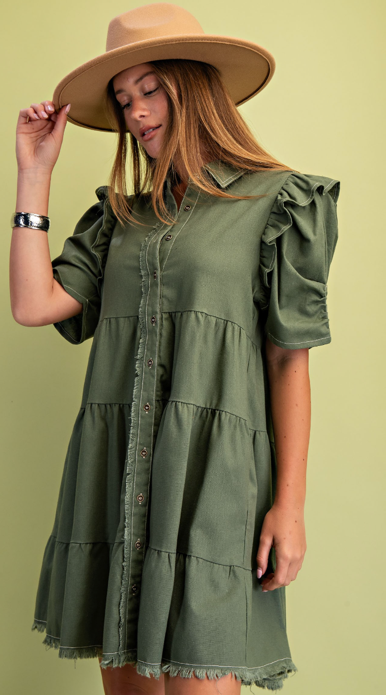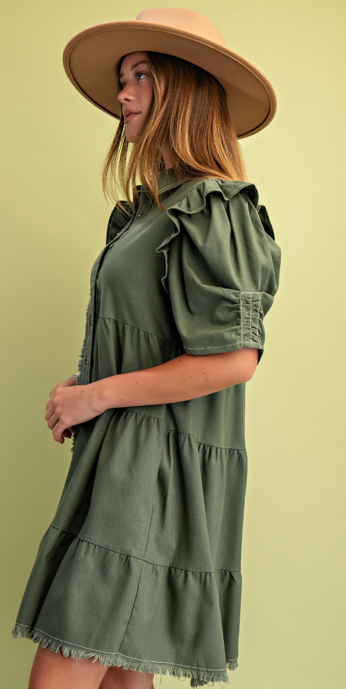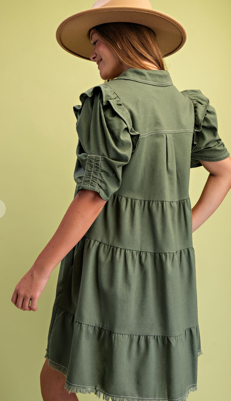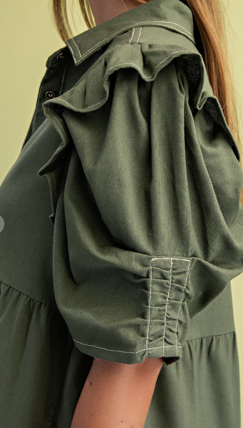 This linen button-up shirt dress combines effortless style with unique details. Featuring gently ruffled gathered sleeves and a subtly frayed hem, it adds a touch of relaxed sophistication to your wardrobe. Lightweight and breathable, it’s perfect for warm days when you want to look effortlessly chic and feel comfortable all day long. Elevate your everyday look with this versatile dress that seamlessly blends classic tailoring with modern texture.