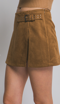 This faux suede mini skirt skort combines style and comfort effortlessly. Featuring a chic side slit and a hidden inner shorts layer, it offers freedom of movement with added coverage. The side zip closure and buckle detail enhance its fashionable appeal while ensuring a secure fit. Crafted from a soft, stretch polyester-spandex blend, it promises durability and a flattering silhouette. Perfect for confidently stepping out in versatile, modern style.