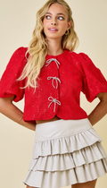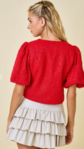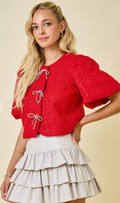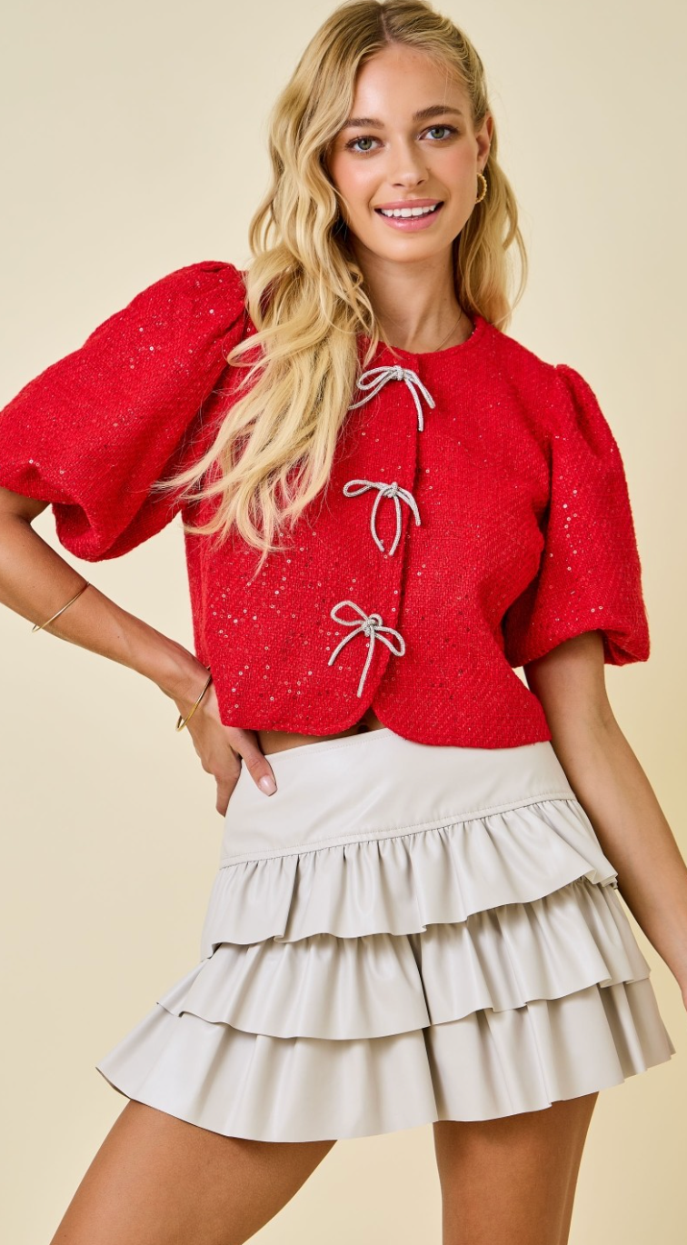 Elevate your style with this Sequins Tweed Balloon Sleeve Crop Top, featuring elegant jewel ties for a touch of sparkle. The voluminous balloon sleeves and cropped silhouette create a chic, fashion-forward look perfect for making a statement at any event. Crafted from textured tweed with shimmering sequins, this top offers both visual interest and a luxurious feel. Stand out effortlessly with this unique blend of classic fabric and modern design.