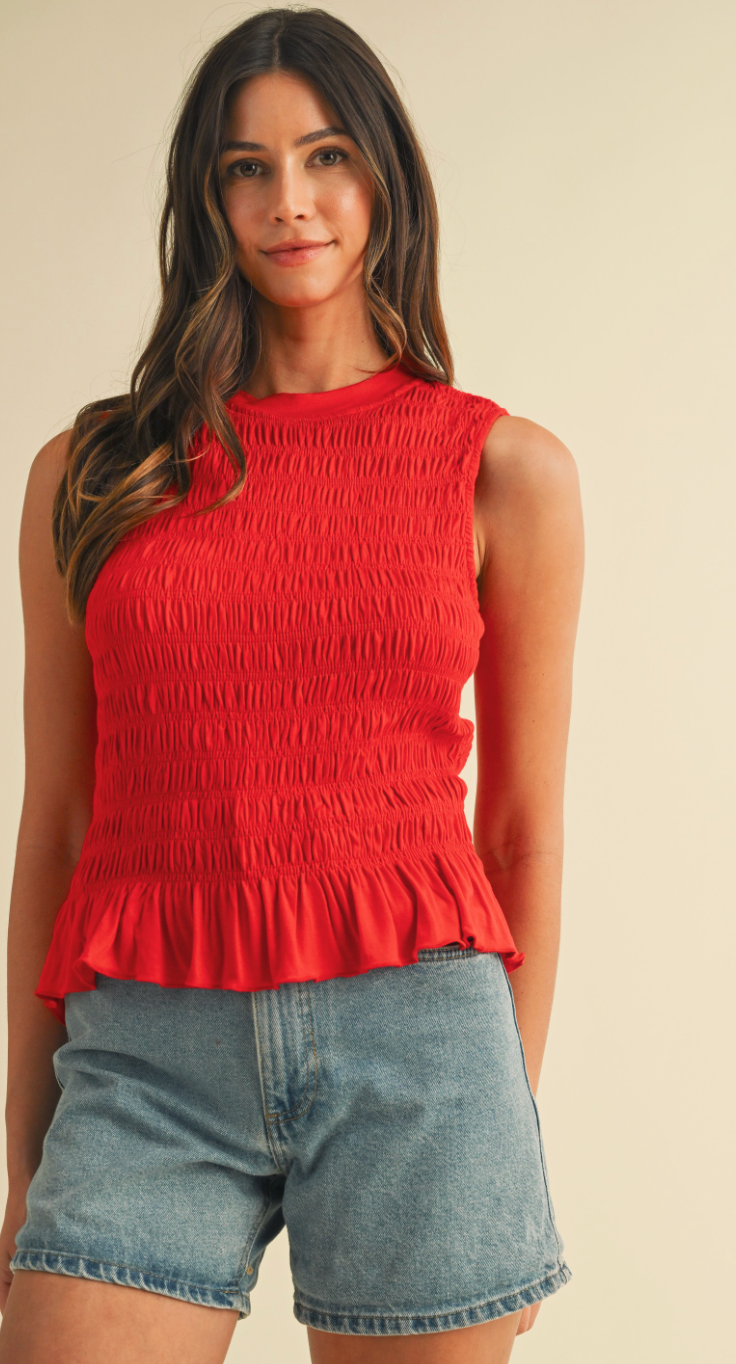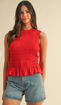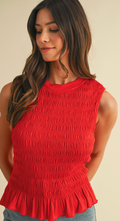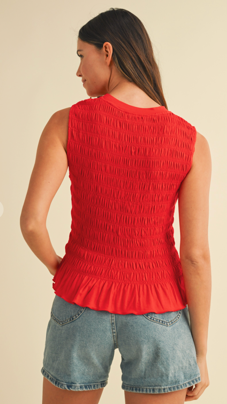 Elevate your warm-weather wardrobe with this smocking detail knit tank top. The delicate smocked bodice offers a flattering, stretchy fit, while the playful ruffle hem adds a touch of feminine charm. Crafted from soft, breathable fabric, this tank ensures all-day comfort and effortless style, perfect for pairing with jeans or skirts for a fresh, chic look.