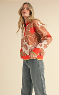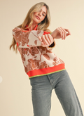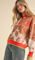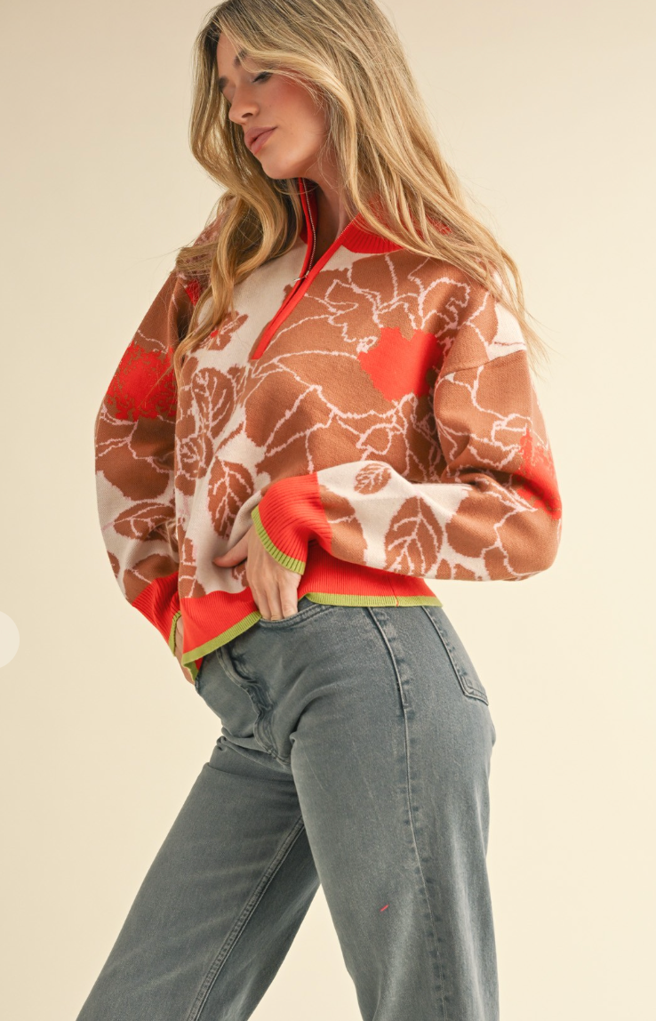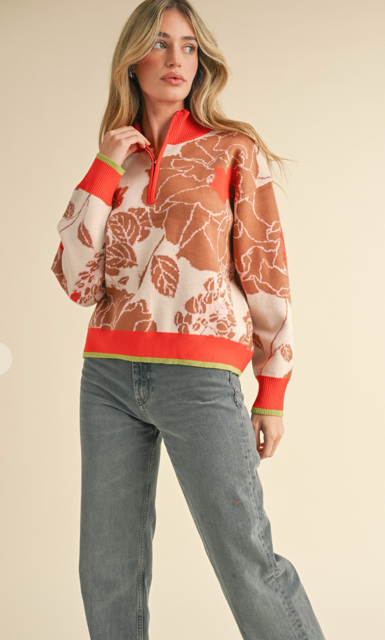 Elevate your everyday wardrobe with this charming floral knit mock neck pullover. Featuring a half-zip ribbed neckline and relaxed silhouette, it's designed for effortless comfort without sacrificing style. Drop shoulders and ribbed cuffs add refined detail, while the eye-catching floral knit pattern brings personality to any outfit. Perfect for layering or wearing solo, this versatile piece transitions seamlessly from casual days to cozy evenings.