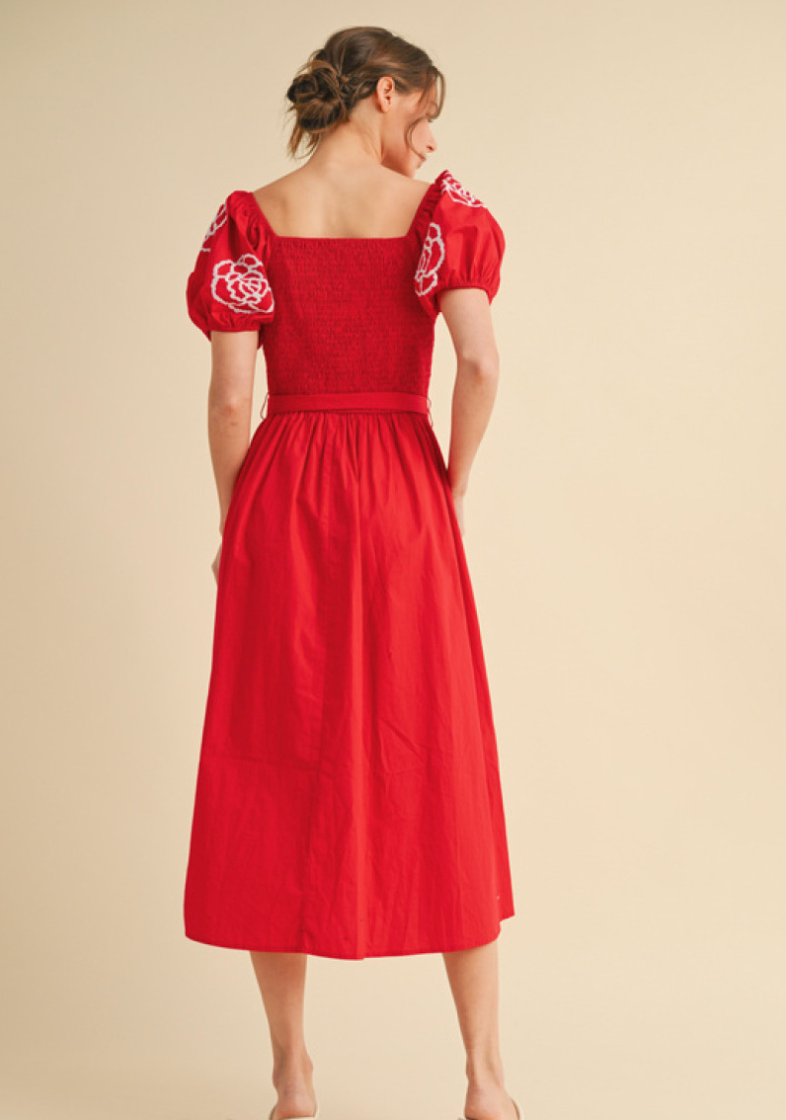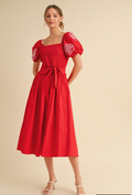 Indulge in effortless elegance with our short puff sleeves solid midi dress. The intricate embroidery sleeves add a touch of sophistication while the wide square neckline and smocked top provide a flattering fit. Complete with a waist tie and side pockets, this dress is both stylish and functional. Elevate your wardrobe today!