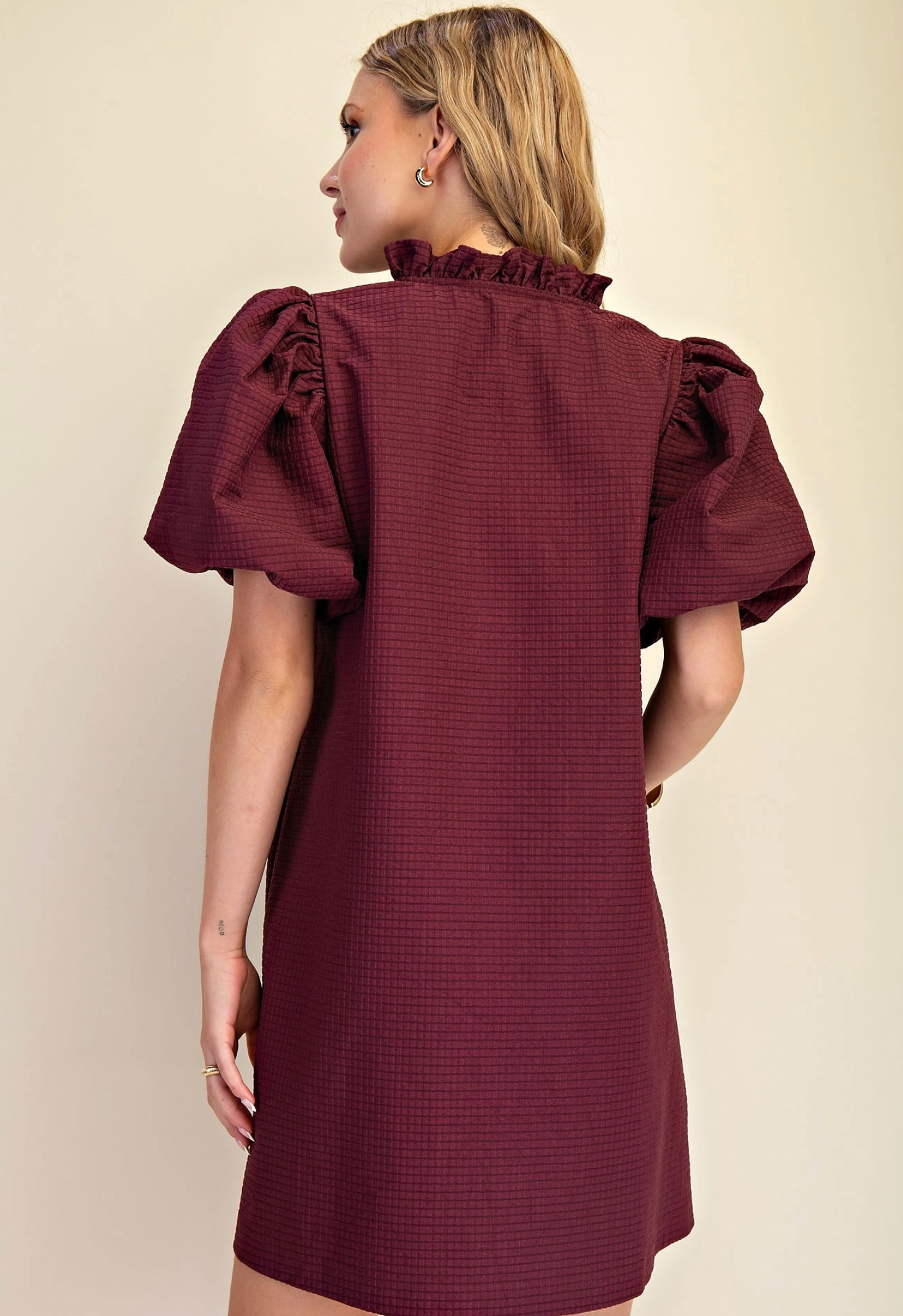 Elevate your style with this Textured Plum Ruffle V-Neck Puff Sleeve Mini Dress. Featuring a flattering V-neckline and playful puff sleeves, the textured plum fabric adds depth and charm to your look. The ruffle details bring a touch of feminine elegance, while the mini length keeps it flirty and fun. Perfect for occasions where you want to stand out effortlessly.