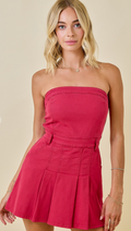 This strapless denim romper dress features elegant pleated details that add a touch of sophistication to a casual look. Its versatile design offers comfort and style, perfect for warm days or layering with your favorite accessories. Embrace effortless chic with this must-have piece that combines the ease of a romper with the flair of a dress.