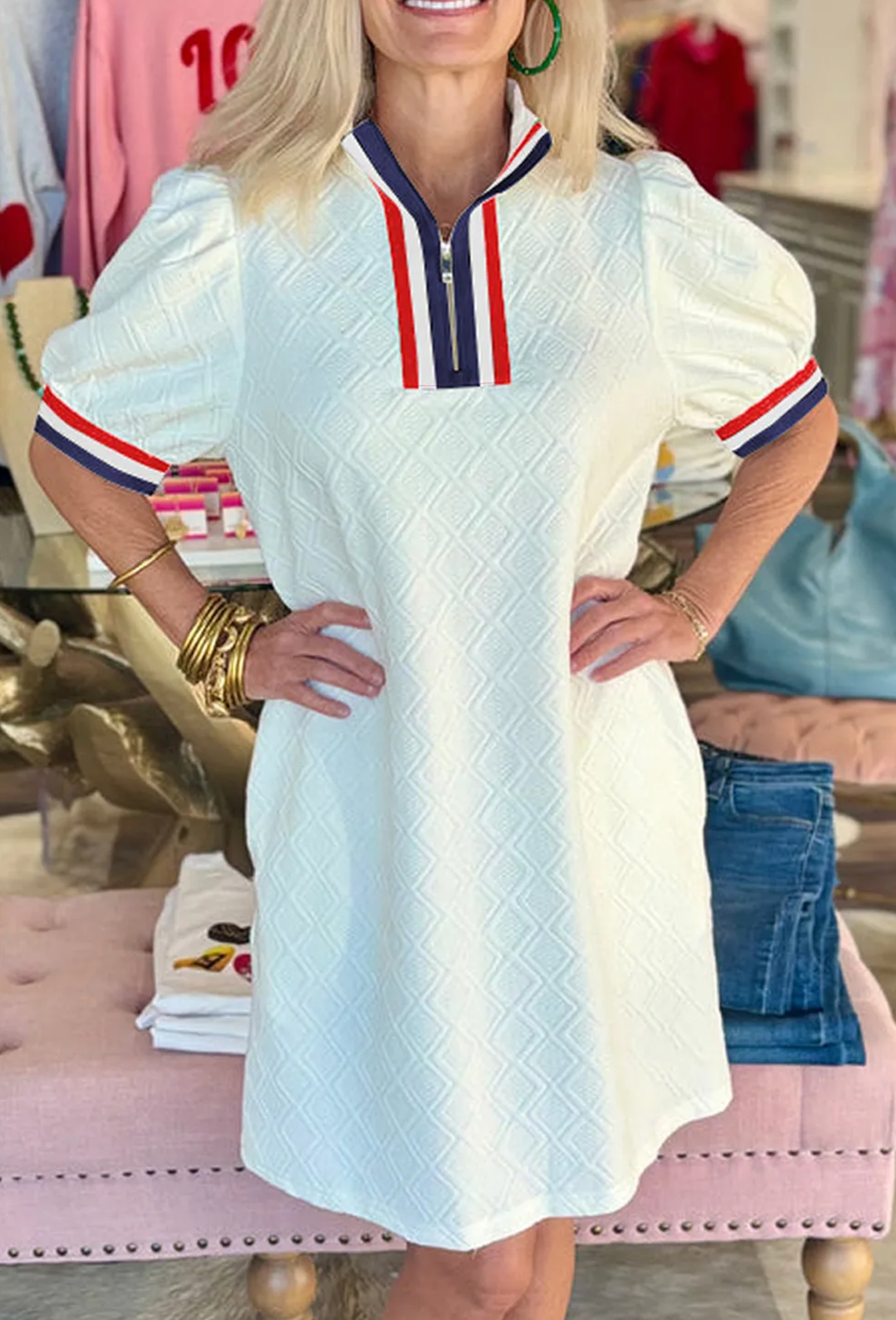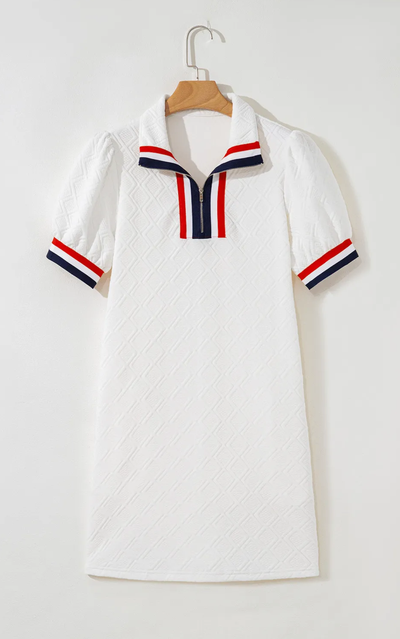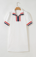 Elevate your wardrobe with this White Textured Jacquard Mini Dress, featuring a stylish colorblock edge and puff sleeves that add a modern, feminine touch. The quarter zip front offers easy wear and adjustable style, while the textured jacquard fabric ensures a flattering fit with subtle dimension. Perfect for day-to-night looks, this mini dress combines comfort and trend-forward design to keep you confident and chic wherever you go.