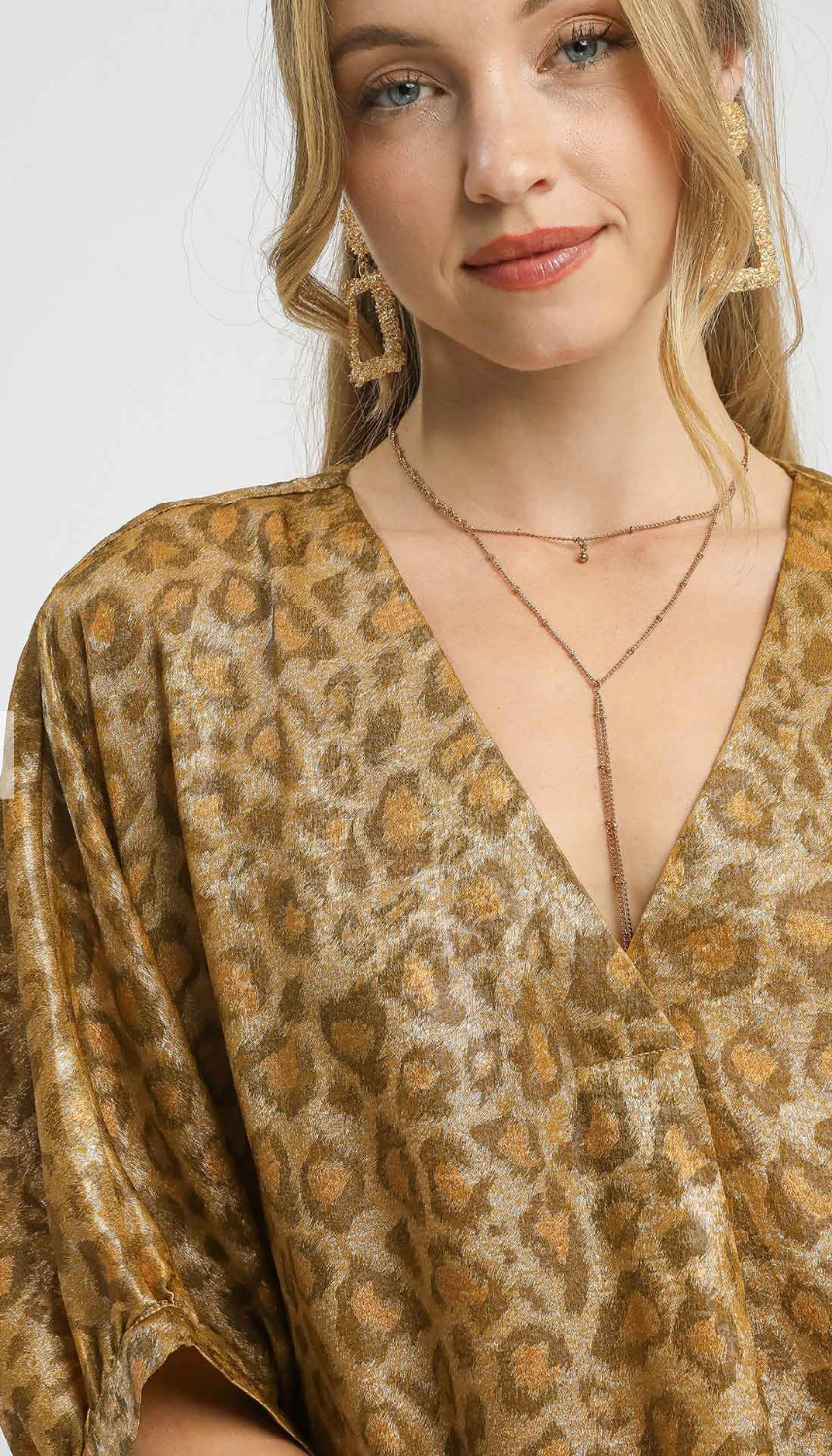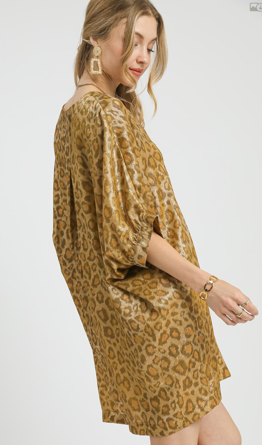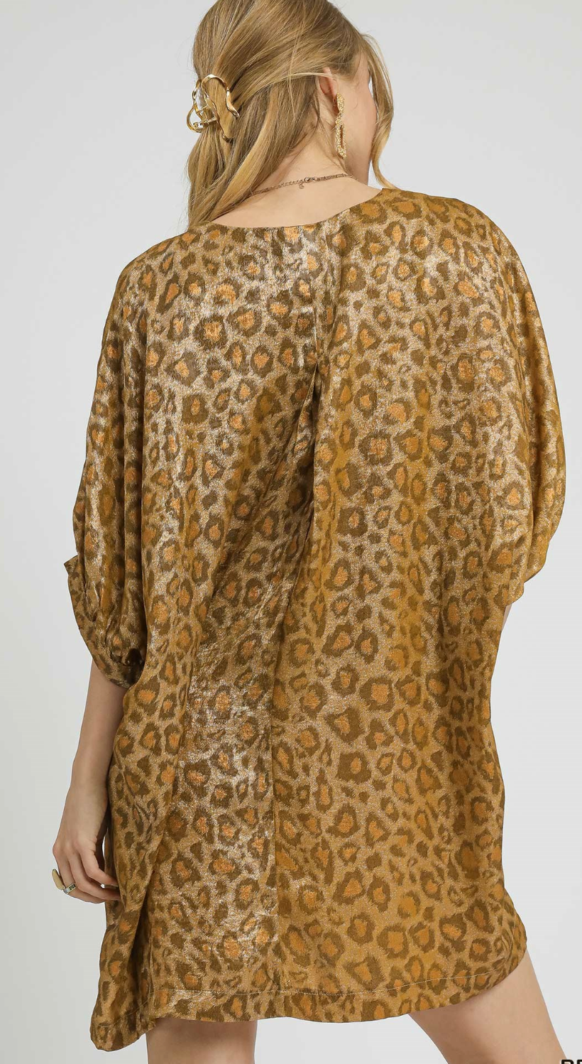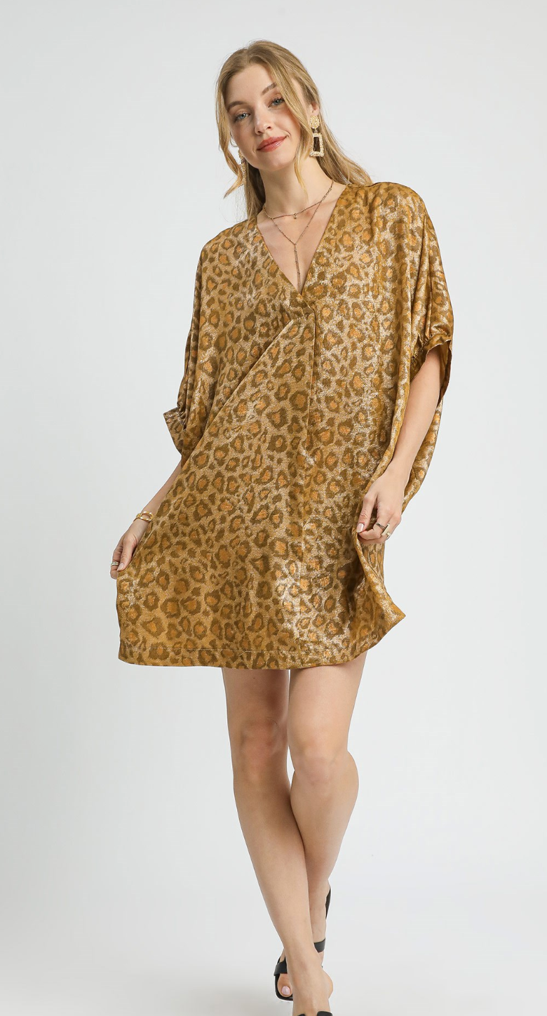 Elevate your style with this Metallic Leopard Print V-Neck Kimono Dress. Its shimmering metallic fabric combined with a bold leopard print creates a striking look perfect for any occasion. The flattering V-neck and relaxed kimono sleeves offer both comfort and elegance, making it an effortless choice for day or night. Stand out confidently and embrace your wild side with this unique, eye-catching dress.