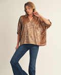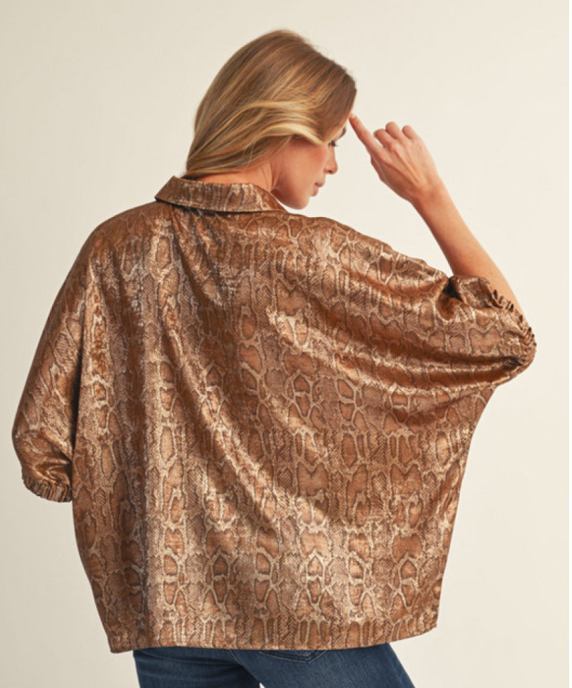 Elevate your style with this metallic snakeskin print top featuring trendy dolman sleeves and a chic collared neckline. The elastic sleeve edges provide a comfortable fit while adding a subtle touch of structure. Perfect for making a bold statement, this top combines edgy design with effortless comfort for day or night wear.