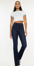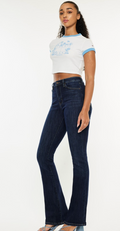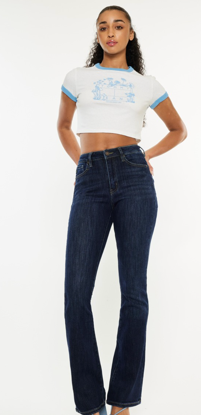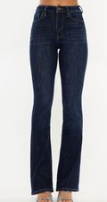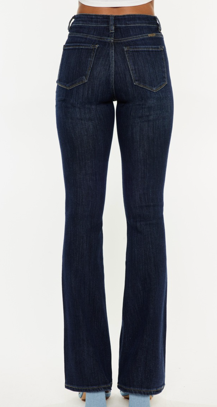HIGH RISE BOOTCUT DARK WASH STRETCH FIVE POCKET STYLE GENTLE DARK WASH LEG OPENING 18" RISE 10" INSEAM 33" IN SIZE 5 65.4% COTTON , 30.3% POLYESTER , 3% RAYON , 1.3% SPANDEX 12.3 OZ