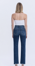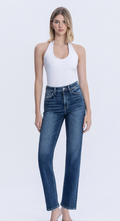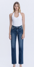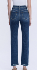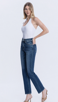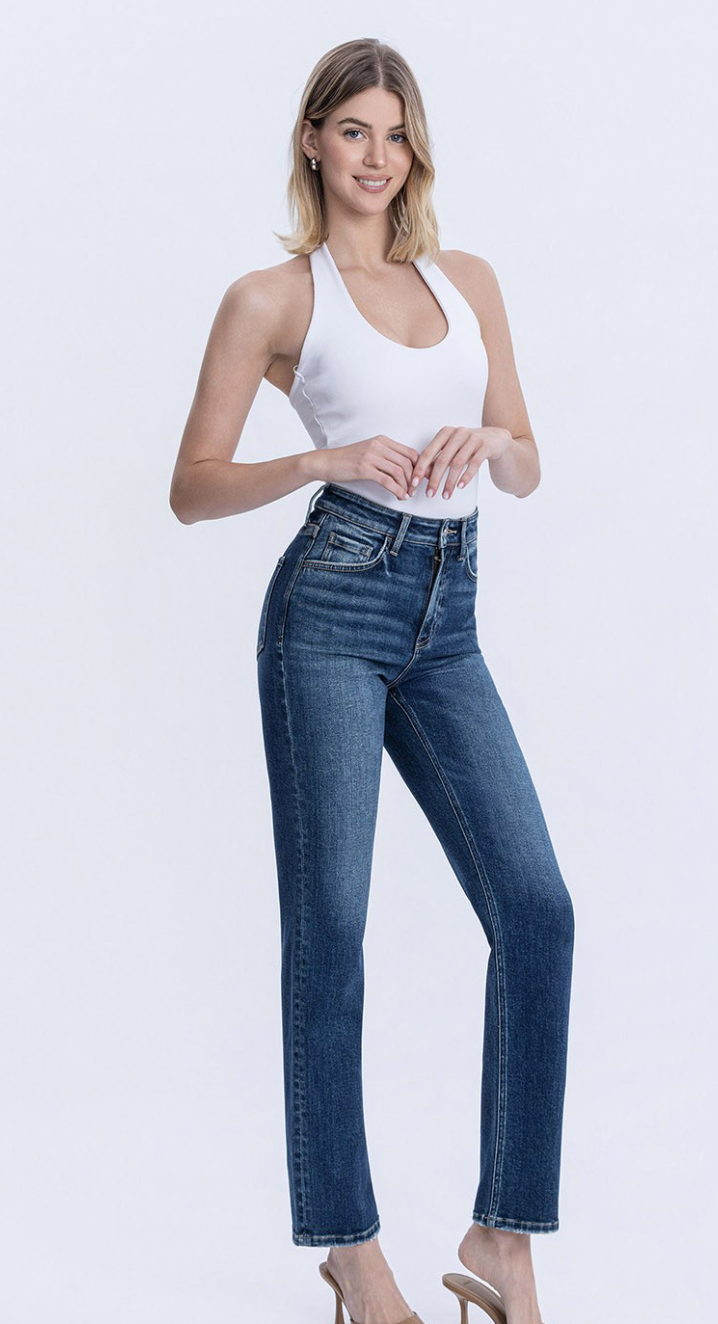 Elevate your everyday style with these high-rise straight jeans crafted from comfortable stretch denim. Featuring a flattering 10½" rise and full 32" inseam, they deliver the classic silhouette you've been searching for. The dark wash pairs effortlessly with any top, while subtle distressing at the back hem adds just the right amount of character. Five functional pockets and a 16½" leg opening complete this versatile wardrobe essential that works as hard as you do.