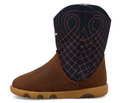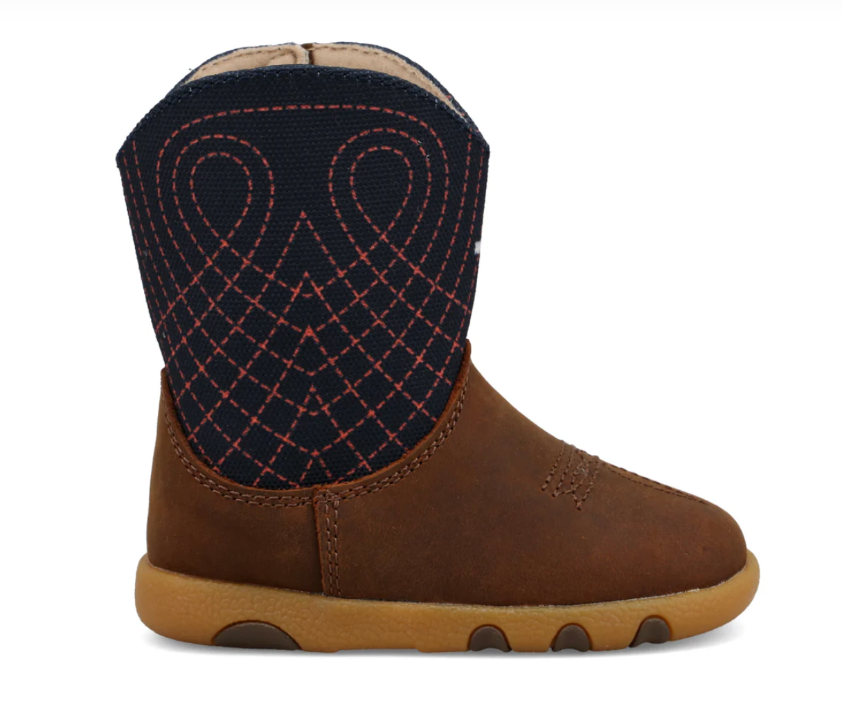 This Driving Moc Boot brings Twisted X® quality to the littlest feet! Handcrafted with a leatherTWX™ and fabric upper using 80% recycled leather, this boot combines comfort, convenience, and sustainability. The hook-and-loop fastener and leather heel tab makes getting ready easy for busy mornings while the Blend85™ footbed made from 85% recycled foam with ecoTWEED™ lining provides cushioned support for growing feet. Finally, the rubber outsole offers the reliable traction they'll need; from first steps to playground adventures, these mocs will keep up!