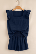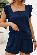 This irresistible two-piece features a chic square neckline top with beautiful textured fabric that adds depth and visual interest to your look. The flattering shirred high-waist shorts create an hourglass silhouette while providing comfort and style.