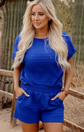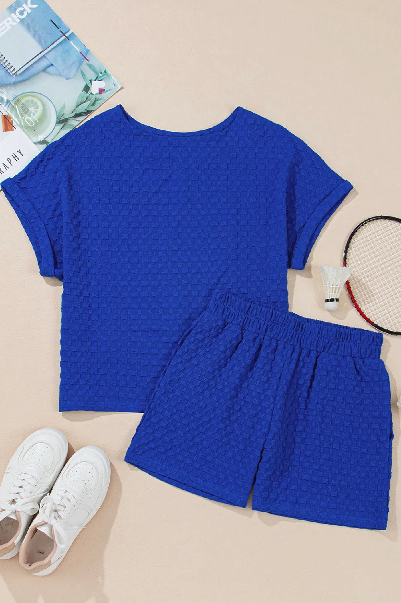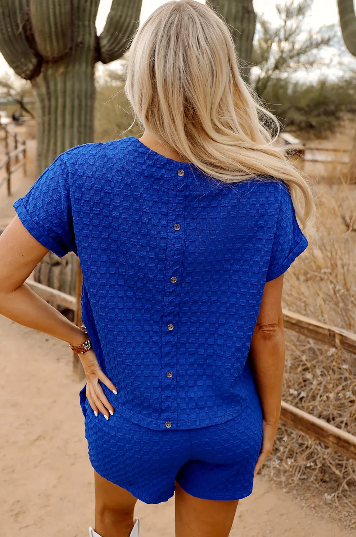 Experience a new level of comfort with our jacquard textured loose fit tee! Stay fashionable and casual with cuffed sleeves and decorative button details, paired with matching shorts featuring an elastic waist and convenient side pockets. Upgrade your wardrobe with this must-have set!