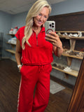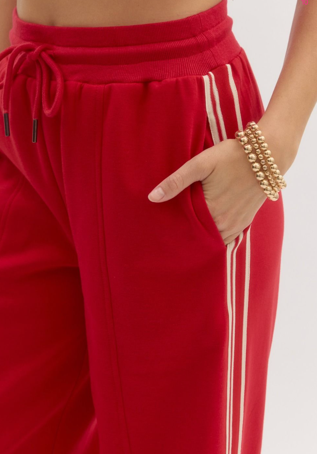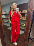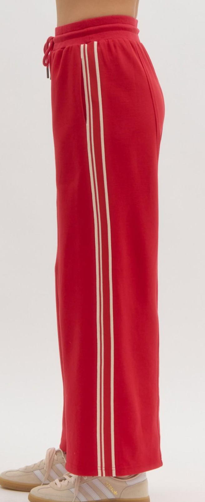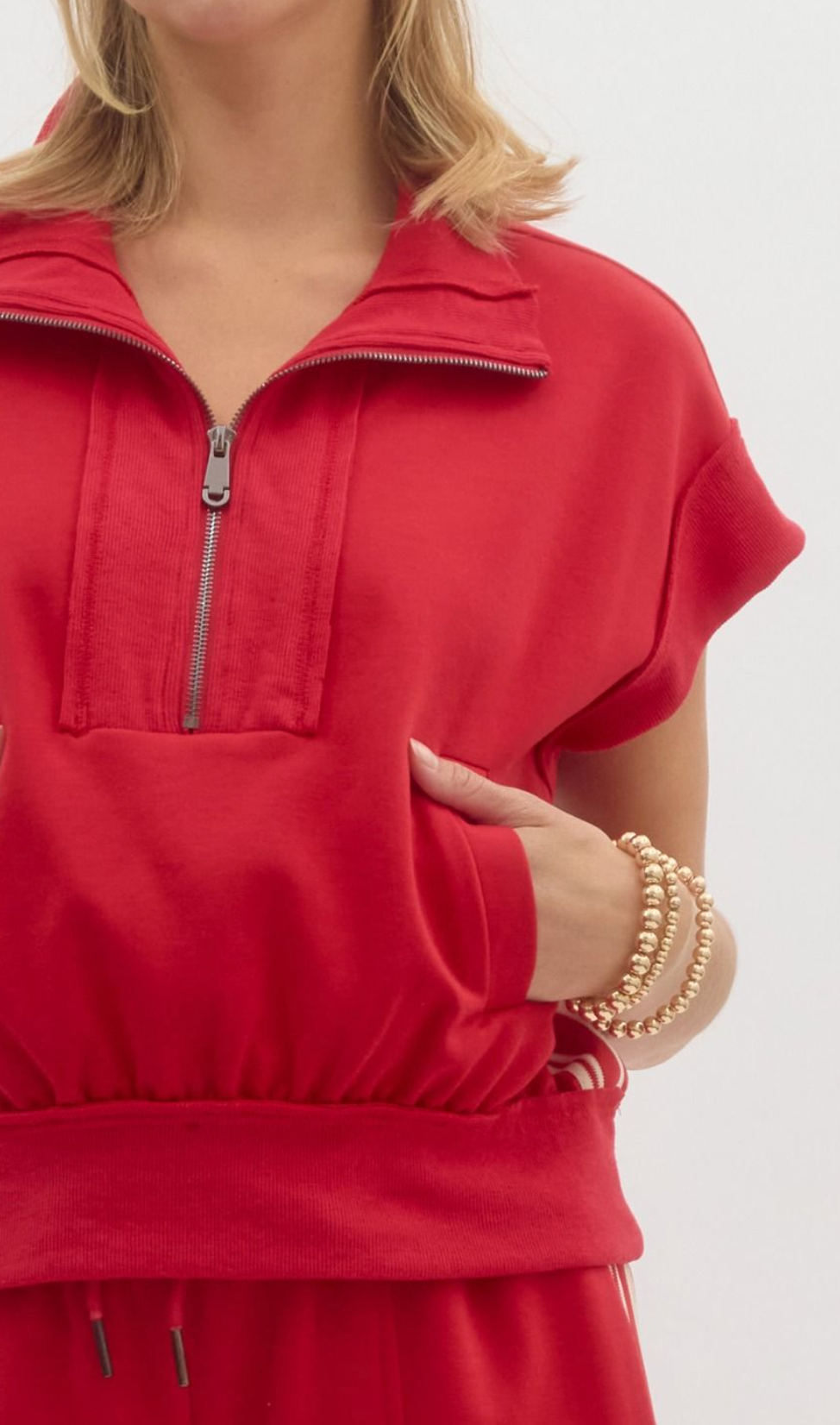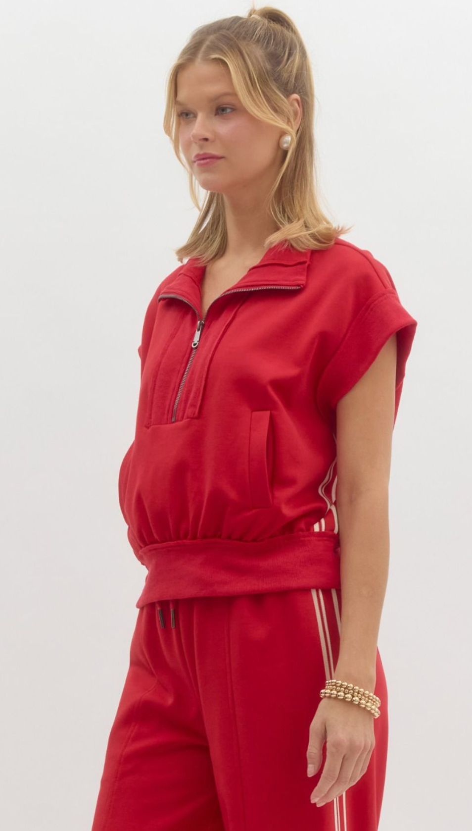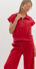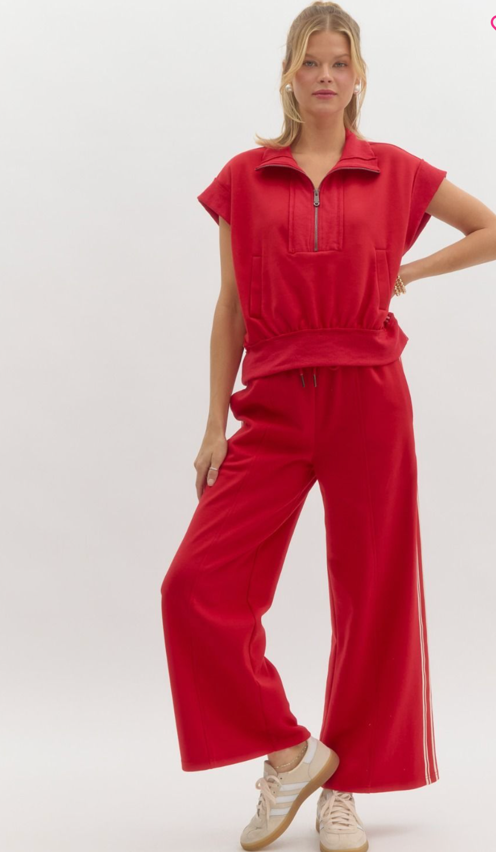 Effortlessly elevate your casual look with our Solid Jersey Pullover Top and Wide Leg Pants! The collared half zip closure and kangaroo pockets add practicality, while the striped rib band and high waist accentuate your figure. Made from non-sheer, lightweight knit for comfort and style.