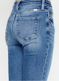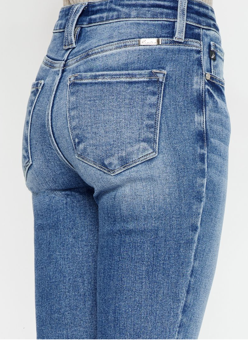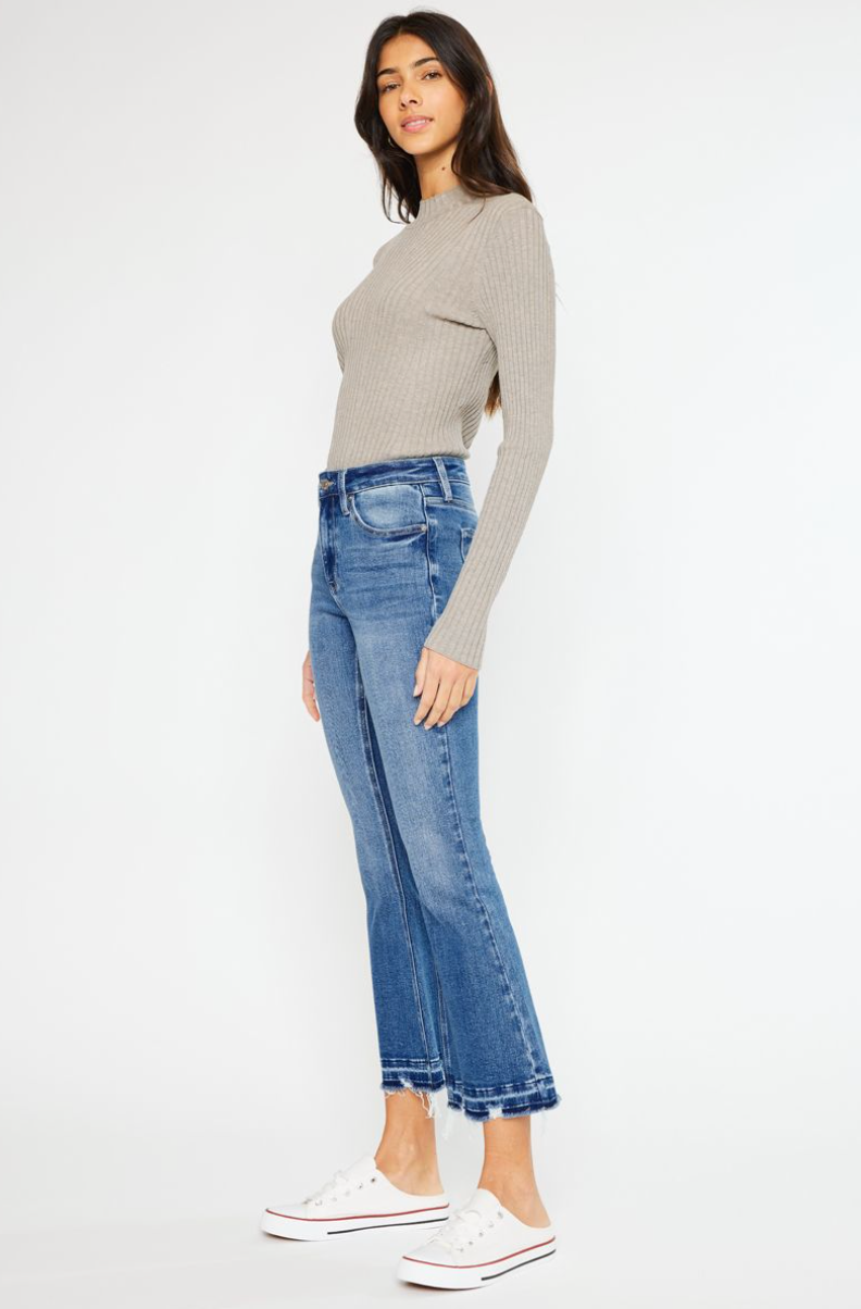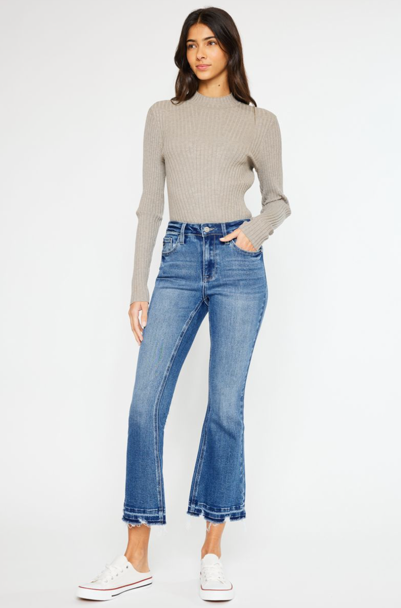 Elevate your style with our High Rise Crop Bootcut jeans! Made with stretch fabric, these jeans hug your curves for a flattering fit. The medium wash and released hem add a trendy touch. Featuring 5 pockets and a zipper fly for convenience. Feel confident and stylish all day long!