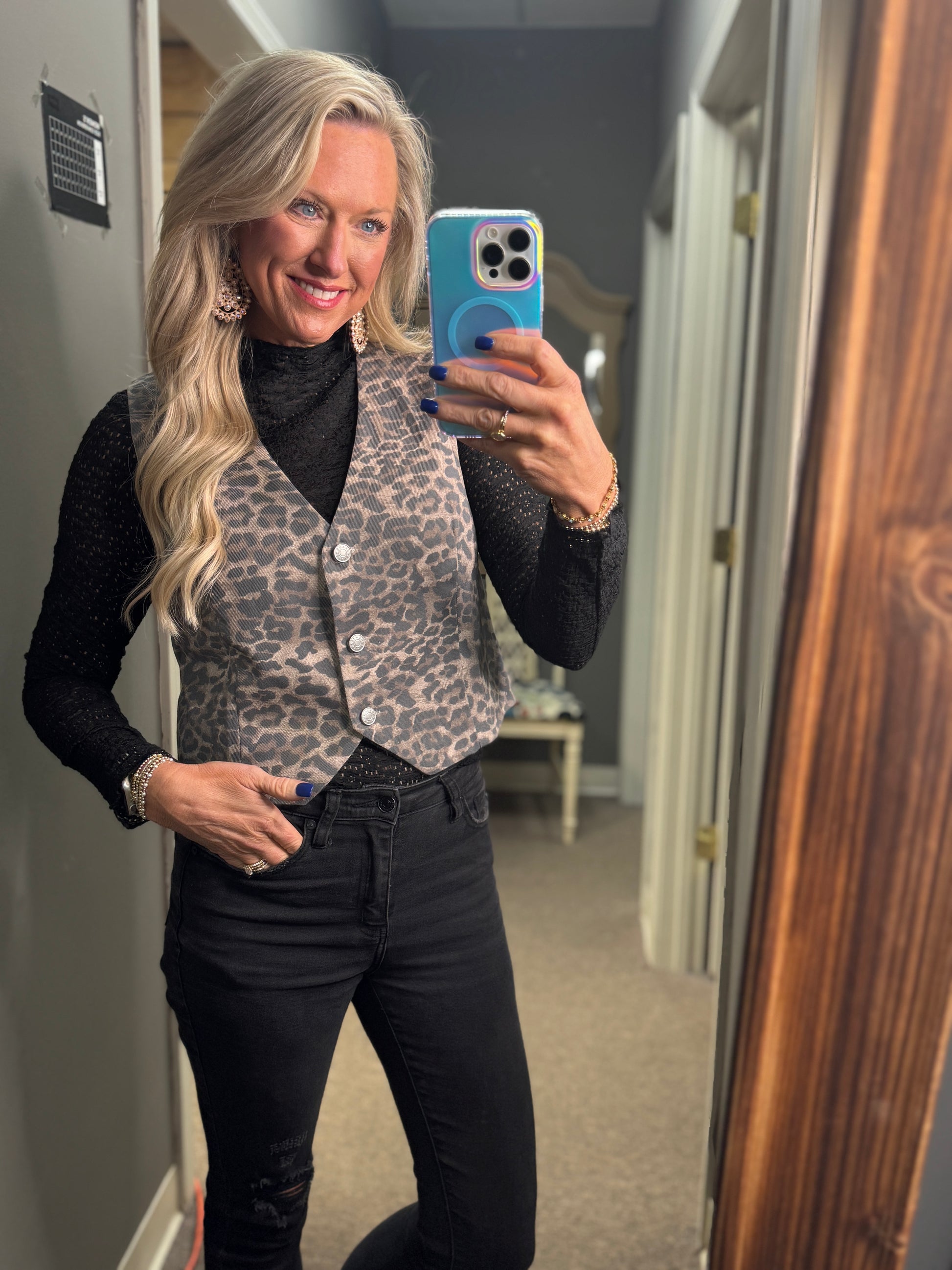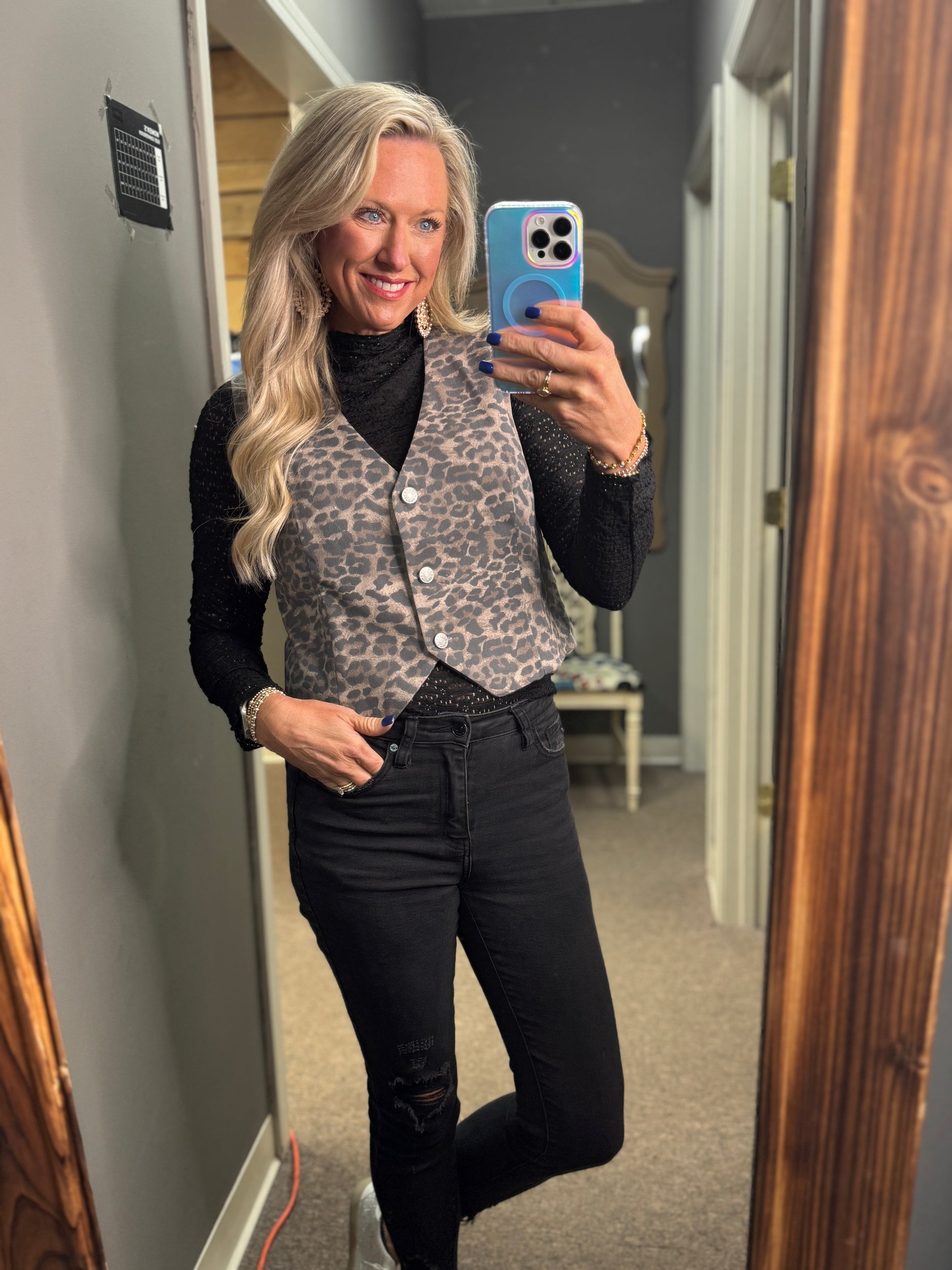 Add a bold touch to your wardrobe with this Leopard Print Vest featuring stylish front ties. Its eye-catching pattern and adjustable ties create a flattering fit, perfect for layering over your favorite tops. Elevate your look effortlessly with this versatile and trendy piece.